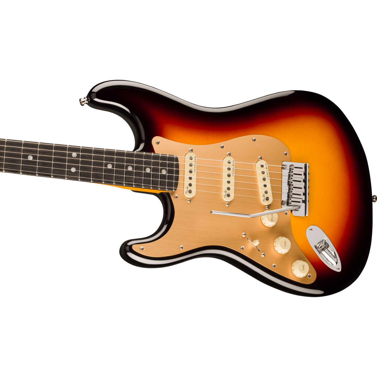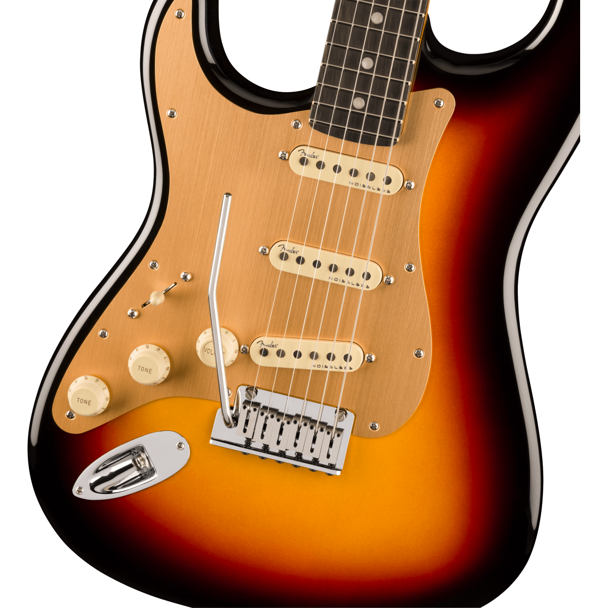 • Tremolo sincronizado American Ultra de 2 puntos con puentes de bloque de acero inoxidable pulido, bloque de acero laminado en frío y brazo Pop-In ;