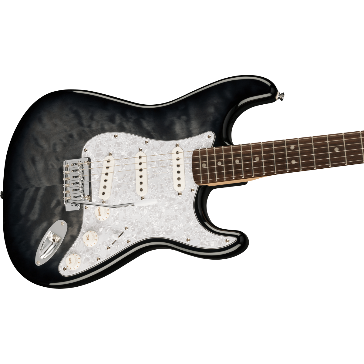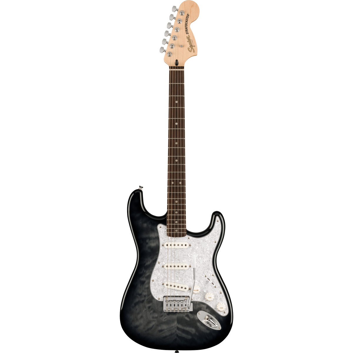 Squier by Fender FSR Affinity Stratocaster QMT LRL WPPG Black Burst.
