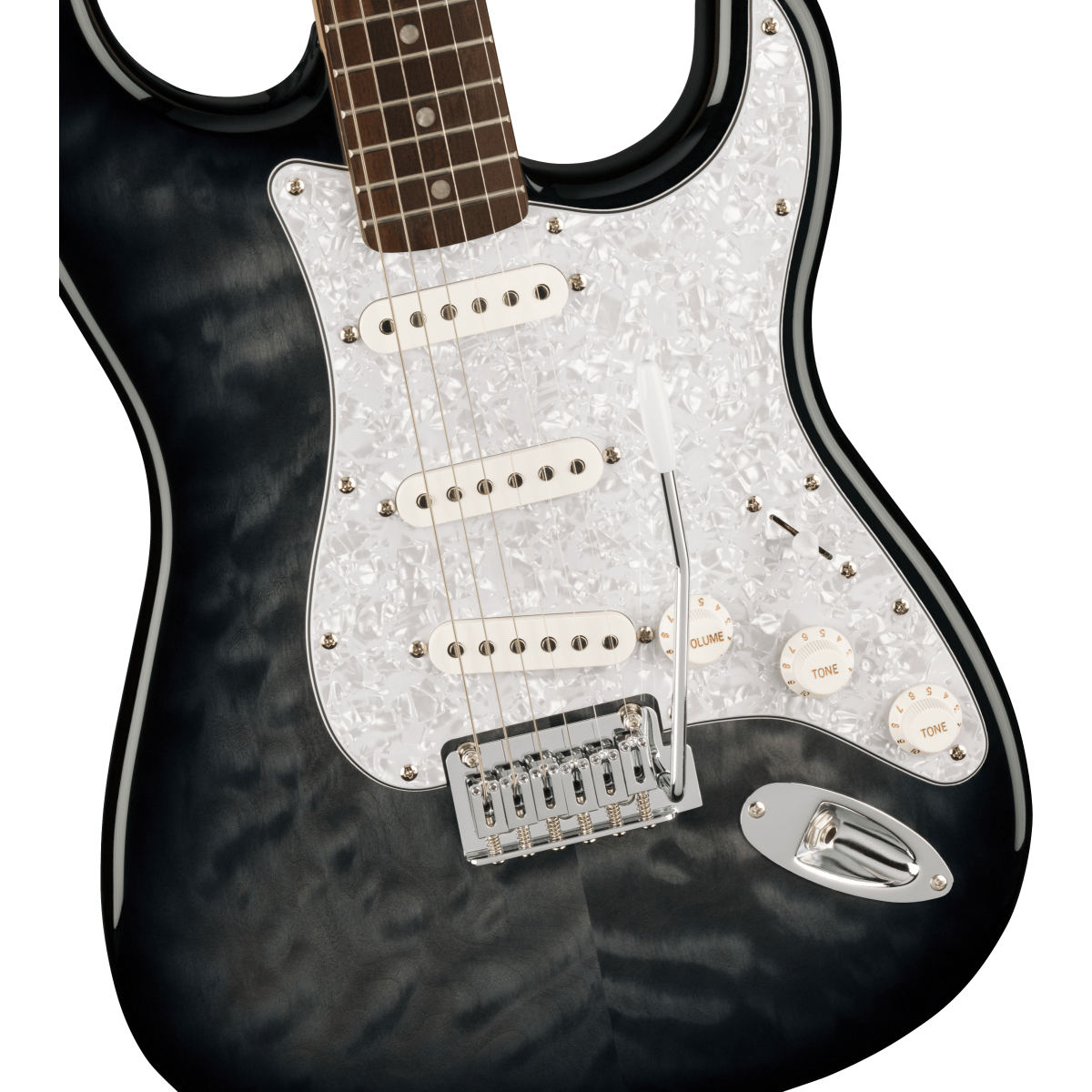 La Squier® Affinity Series® Stratocaster® QMT, una magnífica puerta de entrada a la consagrada familia Fender®, ofrece un diseño legendario y el tono por excelencia para los aspirantes a guitar hero de hoy en día. Esta Strat® presenta varios refinamientos que facilitan la interpretación, como un cuerpo delgado y ligero con una llamativa tapa de arce acolchada (QMT), un mástil delgado y cómodo con perfil en forma de "C", un puente de trémolo de 2 puntas para una acción de trémolo superior y clavijas selladas con varillas divididas para una afinación suave y precisa y una fácil restricción. Cargada con tres pastillas Squier de bobina simple para una variedad sónica que desafía géneros, este modelo está listo para acompañar a cualquier intérprete en cualquier etapa.