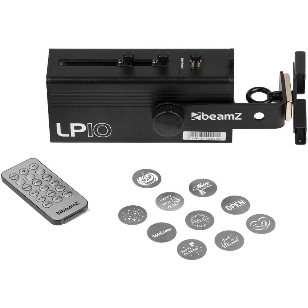 - Projetor de logotipo com LED de alta potência de 10W - Bateria recarregável embutida - Vida útil da bateria: Até 6h com potência máxima - Zoom manual e nitidez - Função de escurecimento - Incluindo 10 gobos (intercambiáveis) - Tamanho do gobo: 25,8 mm - Controlo remoto infravermelho - Suporte multifuncional (magnético, montagem M10 e clipe de tesoura)