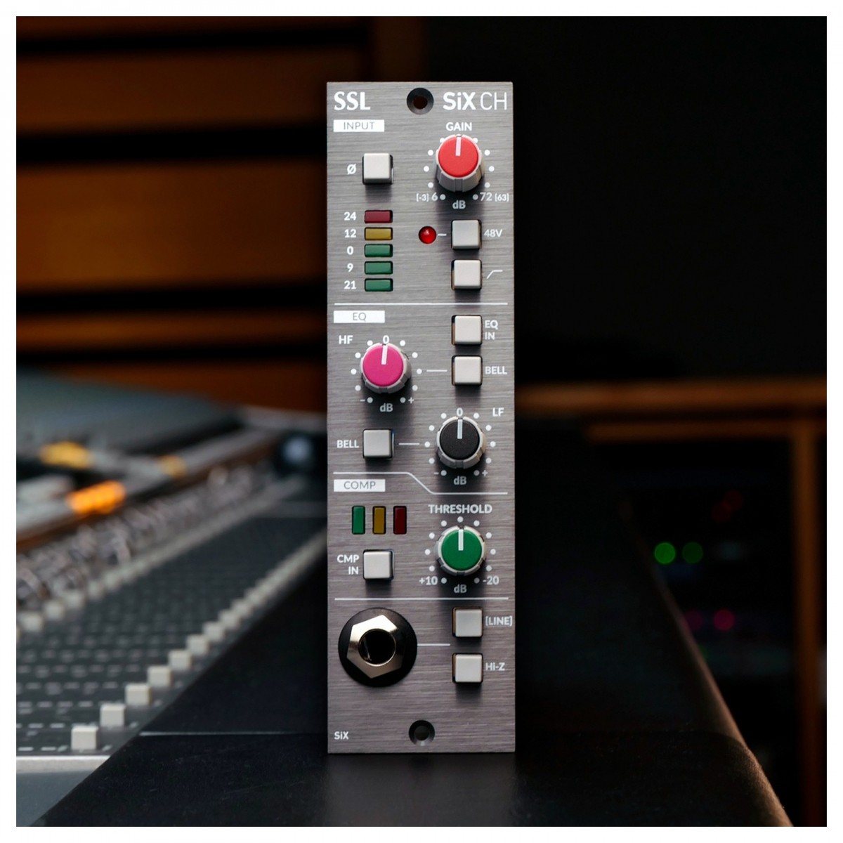 Incluso puede procesar señales de instrumentos utilizando la entrada de línea TRS o utilizarla para convertir la banda de canales SiX-CH en un versátil módulo sumador. Capture el sonido clásico de las consolas SSL, en un módulo compacto de 500 series.
