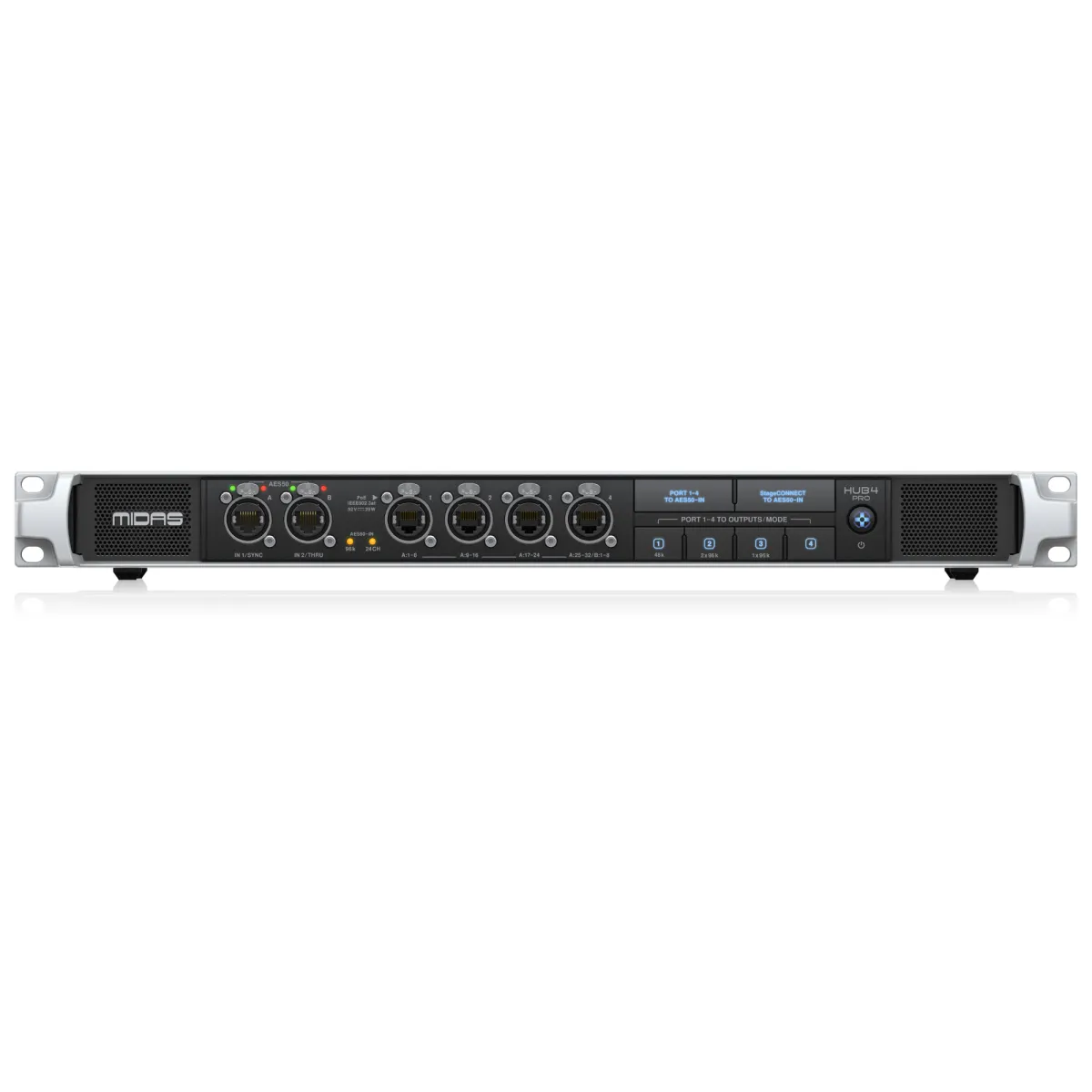 • Puertos AES50 IN y THRU para conectar en cascada concentradores o cajas de escenario con 48 canales bidireccionales a 48/44,1 kHz, o 2x 24 canales a 96 kHz ;