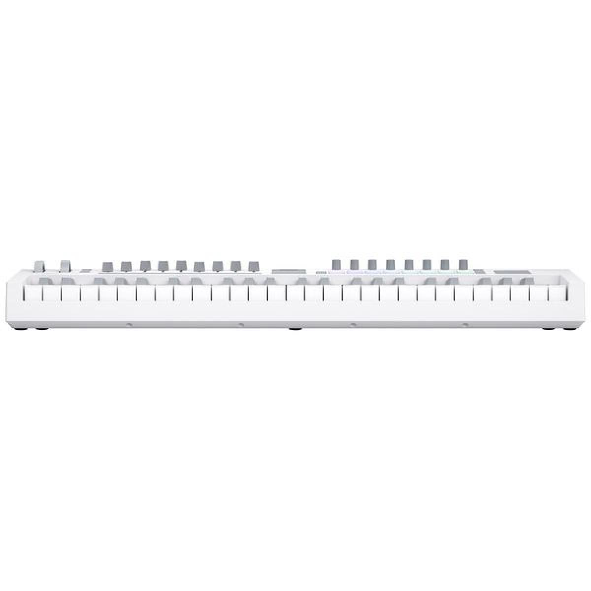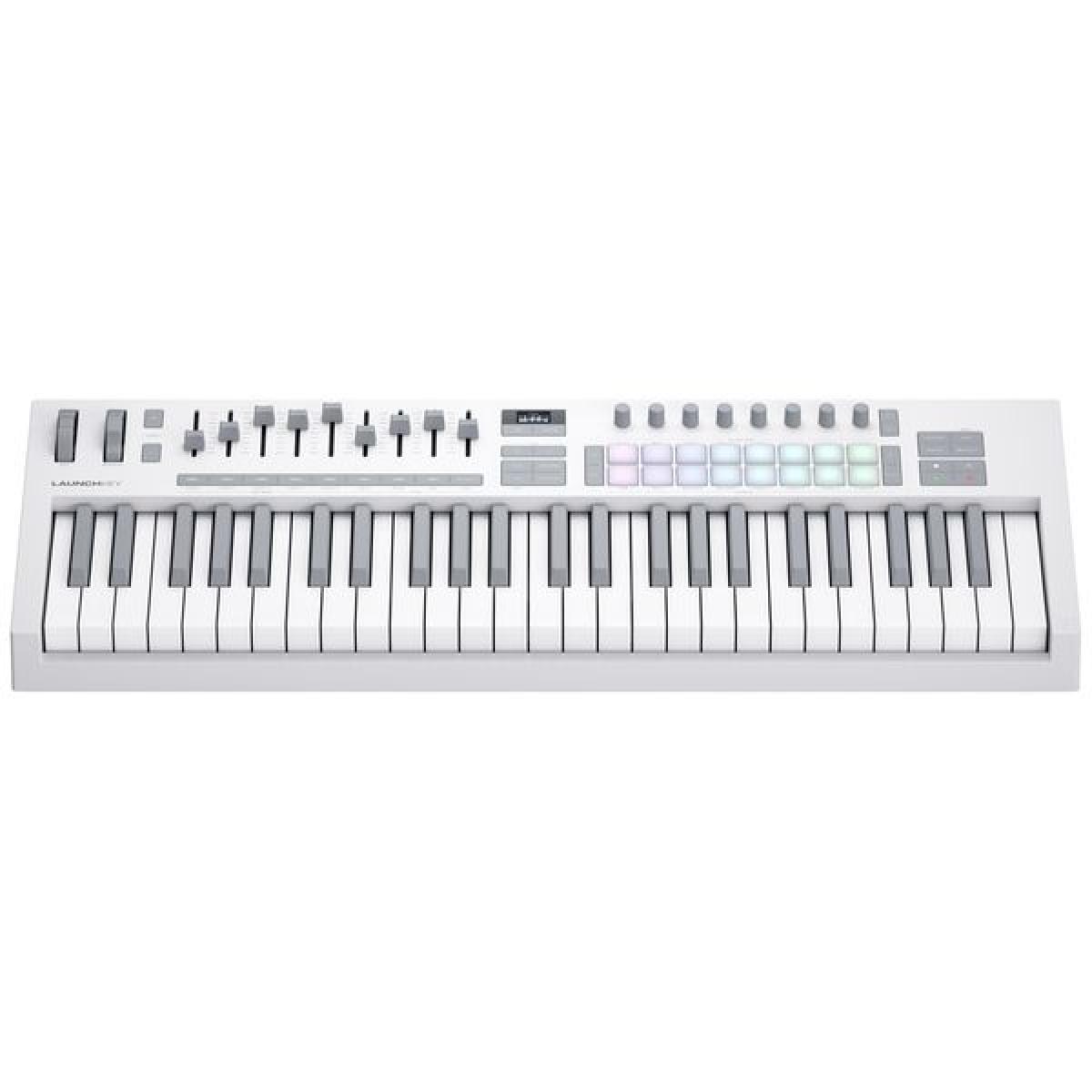• Botones para octava arriba/abajo, arp/escala/acorde fijo, play/stop/record/loop, navegación por pistas, stop/solo/mute, captura MIDI/cuantificación/click/undo, inicio de escena, así como funciones de selección y bloqueo de dispositivos ;