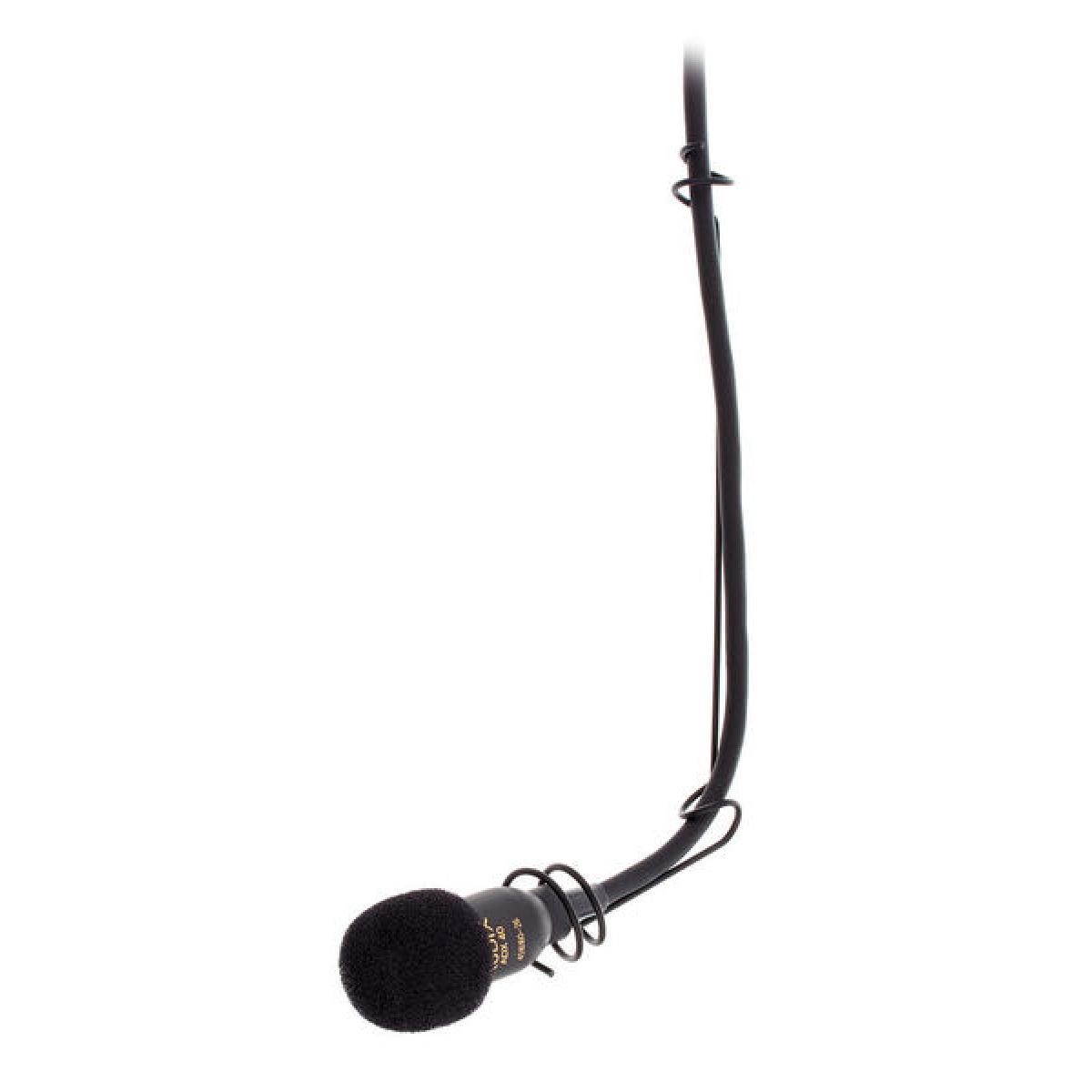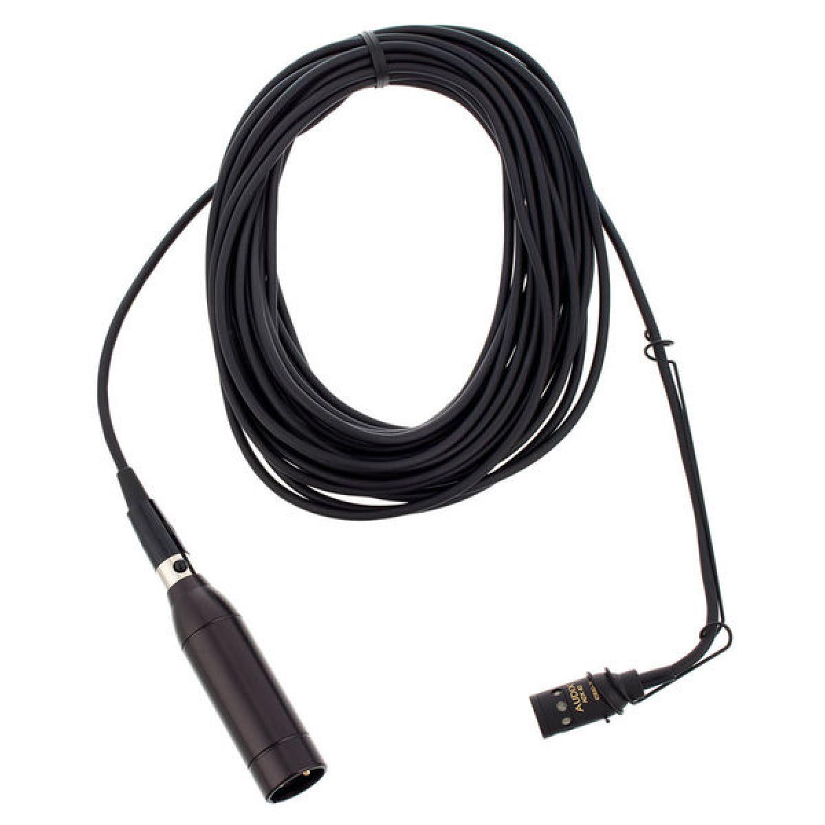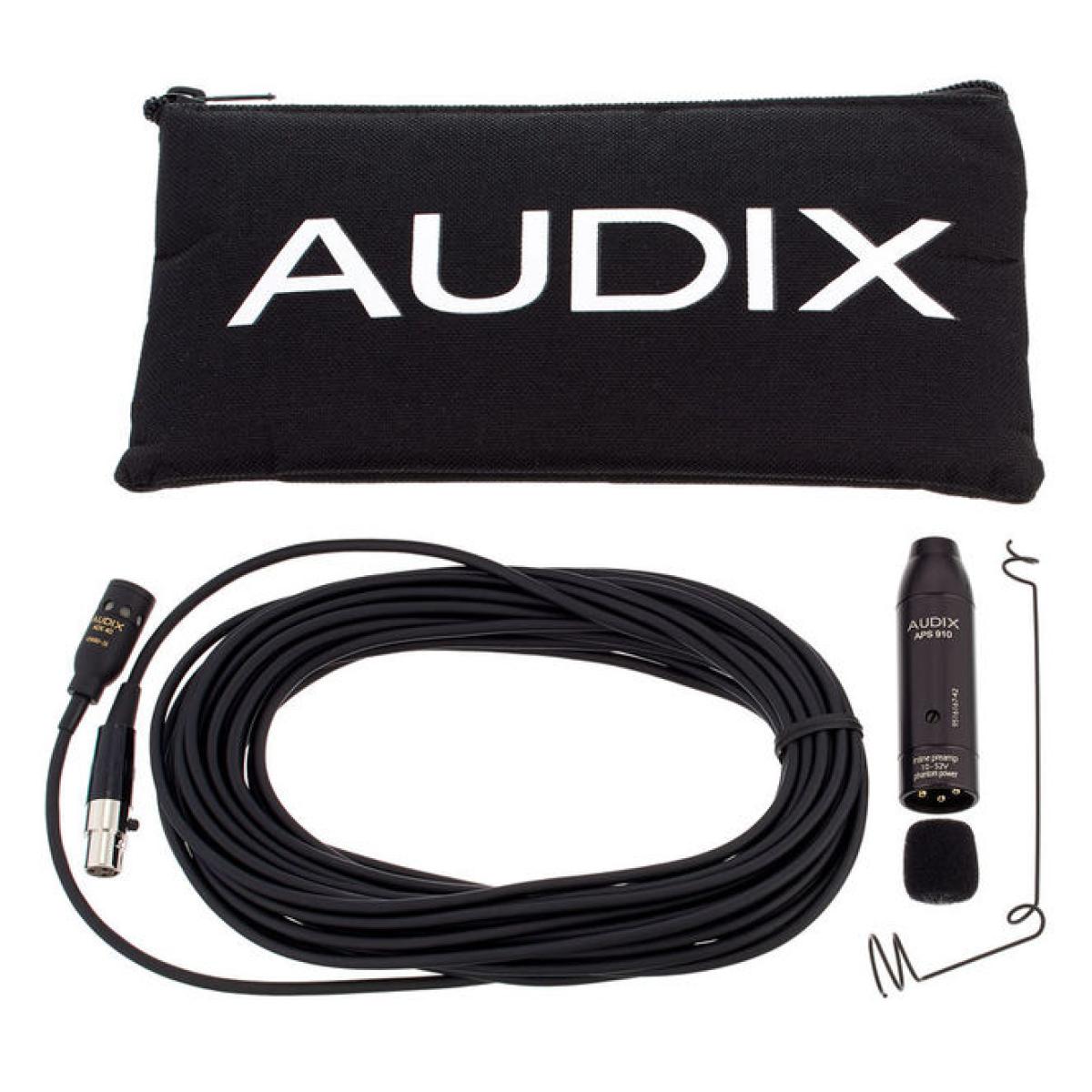 Audix ADX 40 Micrófono colgante Patrón polar: Cardioide Rango de frecuencia: 40 - 20.000 Hz Máx. SPL: 130 db9-52 V Requiere alimentación fantasma Cable de 9,1 m (mini XLR - XLR) Convertidor de alimentación fantasma / electrónica (APS910, mini XLR - XLR a XLR macho) Colgador de cables MC40 para la colocación del micrófono suspendido Protección contra el viento WS20 Caja de transporte Color: Negro