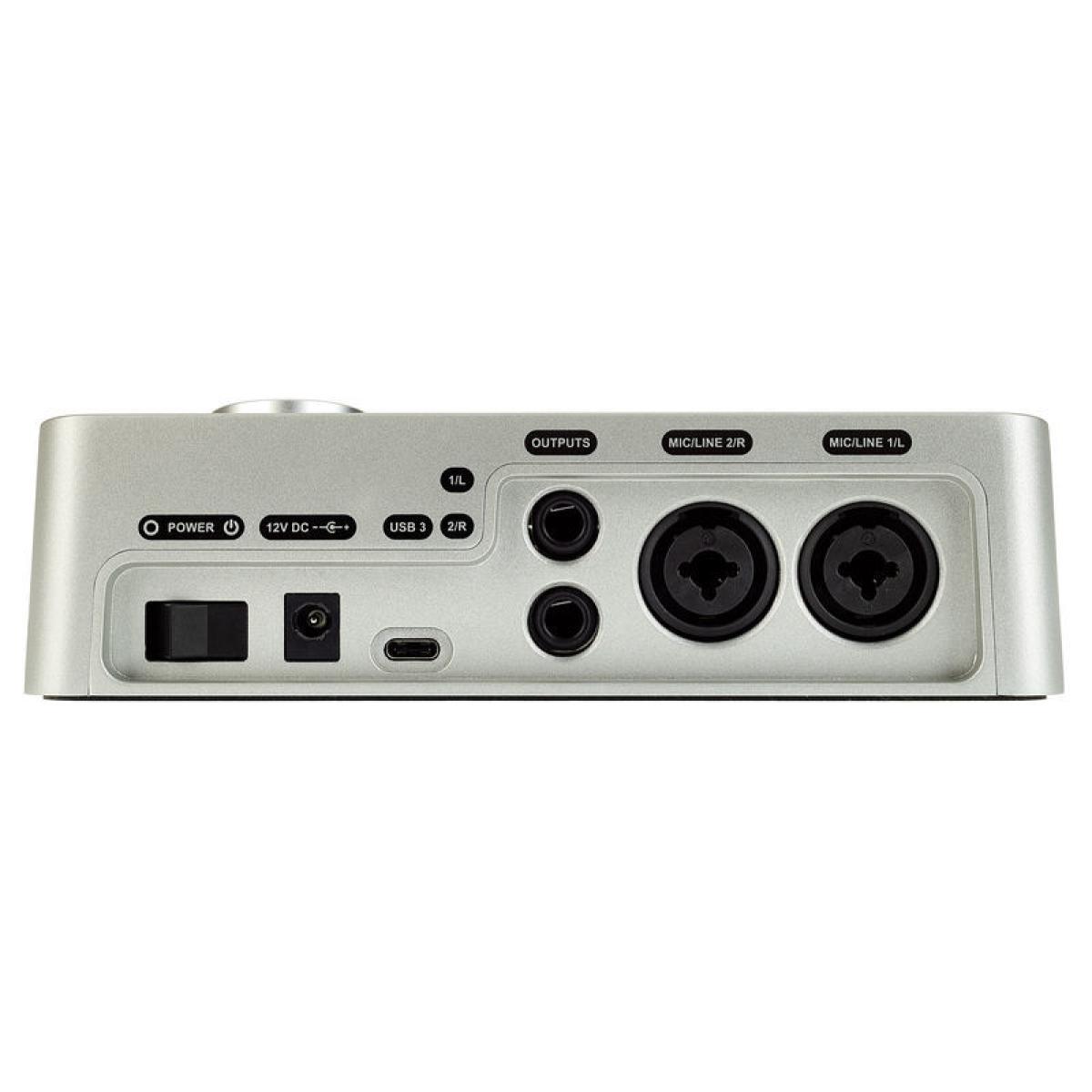 La interfaz cuenta con dos entradas combinadas para micrófonos (XLR) e instrumentos (línea). También cuenta con una entrada de guitarra Hi-Z en el panel frontal para mayor comodidad.