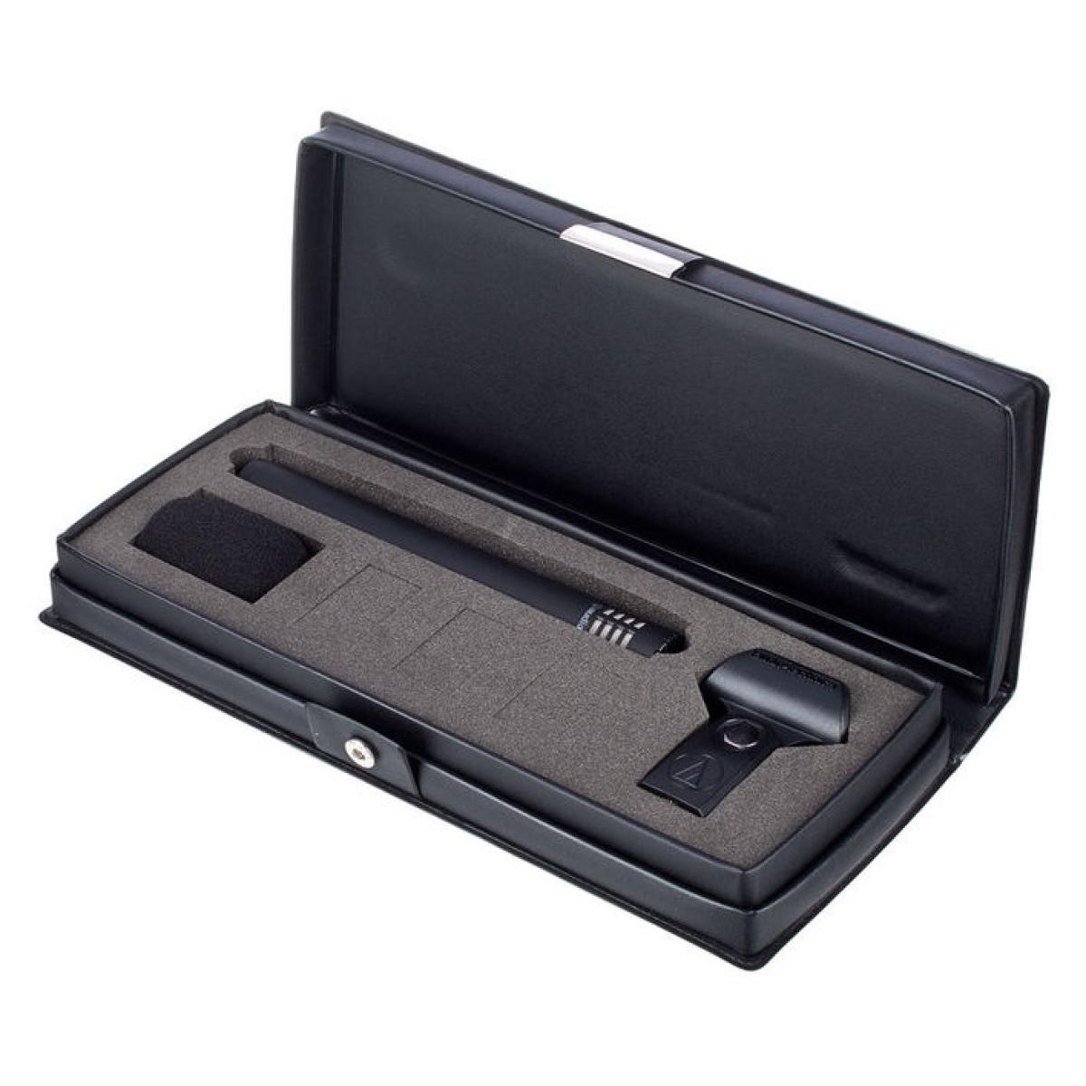 Micrófono de condensador de diafragma pequeño Para todo tipo de grabaciones Cápsula hipercardioide (AT4053b-EL reemplazable) Rango de frecuencia: 20-20.000 Hz Corte de graves conmutable a 80 Hz Impedancia: 50 Ohm Pad conmutable de 10 dB, 145 dB SPL máx. (155 dB a pad de 10 dB) Rango dinámico: 129 dB Carcasa de latón Dimensiones : 155 x 21 mm Peso 127 gIncl. Adaptador de soporte AT8045a, parabrisas y estuche de transporte