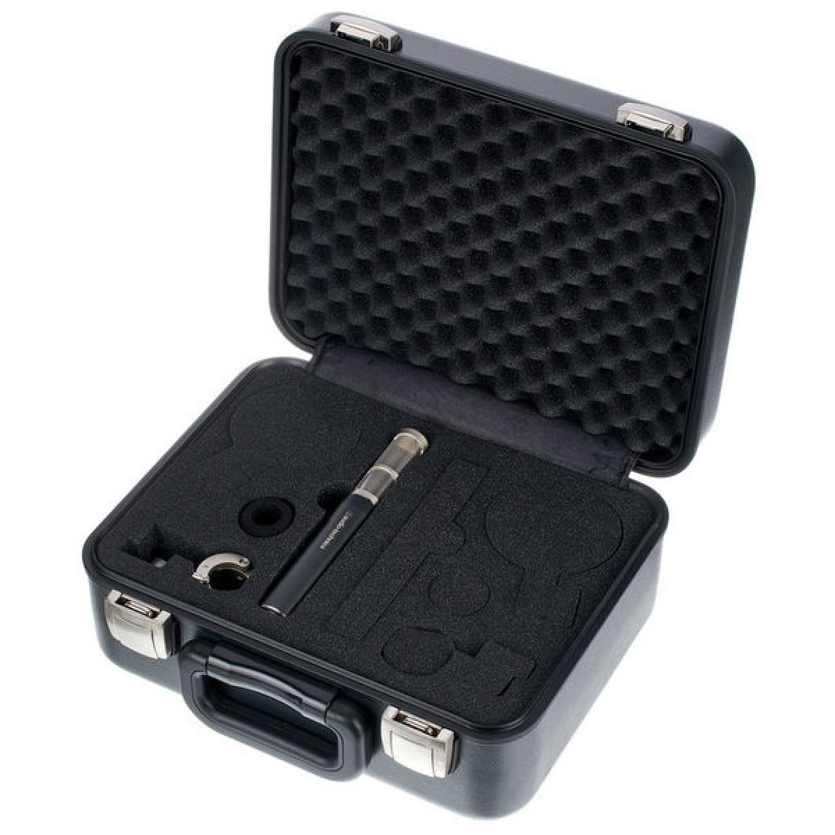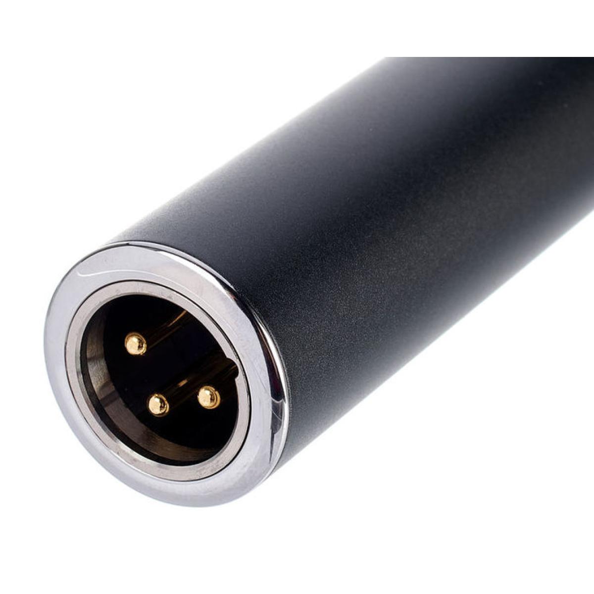 Palillos para micrófono de condensador Membrana única grande en una carcasa compacta Especialmente para la aceptación aérea de todos los instrumentos acústicos como guitarra, cuerdas, percusión, etc. Directividad: Cardioide Rango de frecuencia: 20 - 20.000 Hz Presión sonora límite: 149 dB Sensibilidad: -35 dB (17,7 mV) re 1V @ 1 Pa Requiere alimentación phantom de 48 V Caja de aluminio-cobre Dimensiones: 177 x 25 mm Peso: 197 g