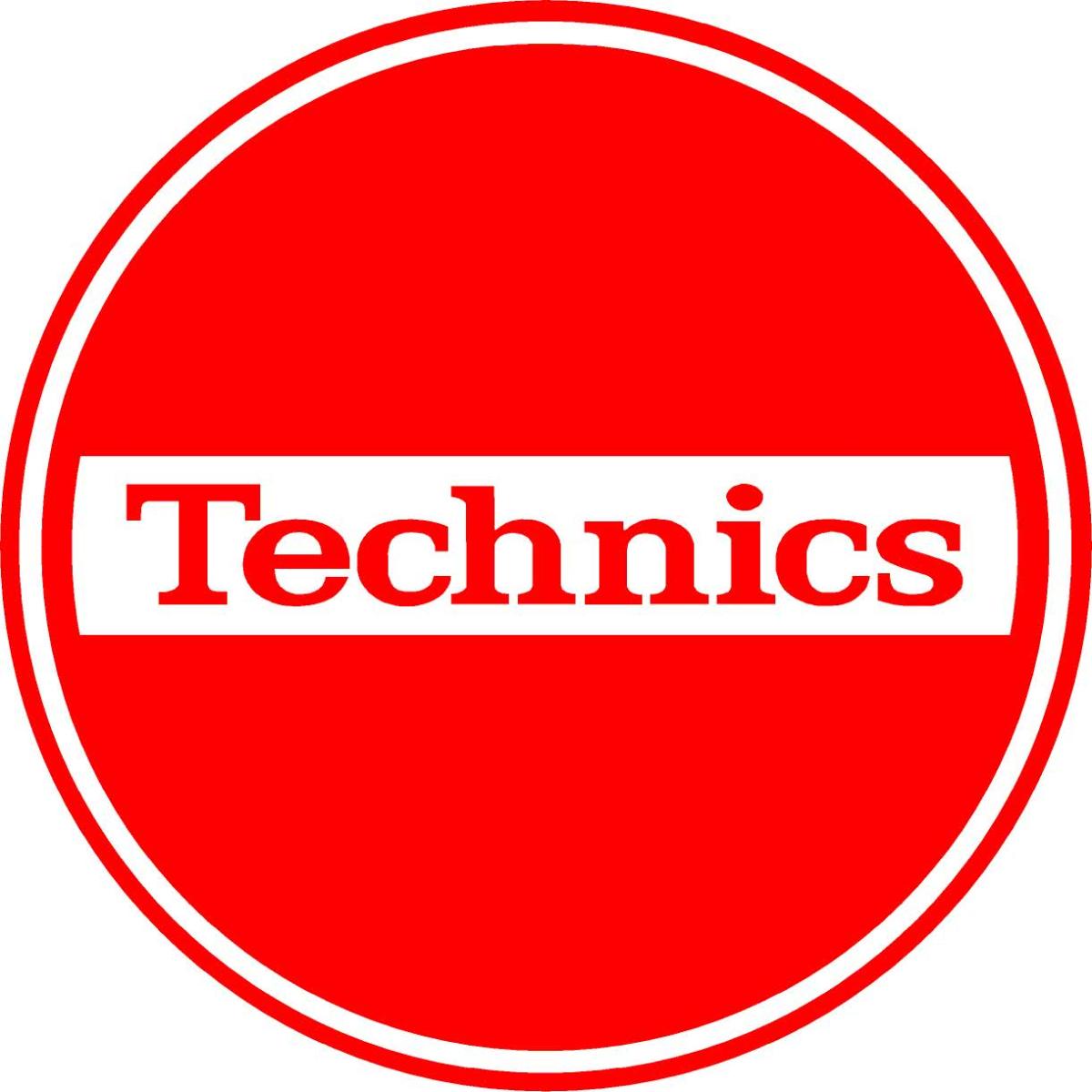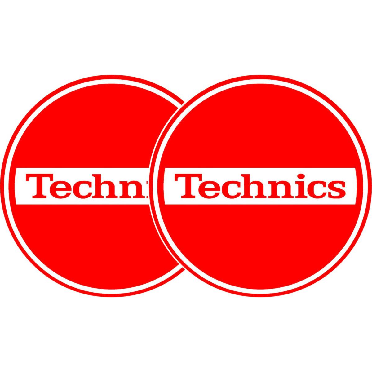 Dos alfombrillas con el logotipo de Technics sobre el fondo de una señal roja de STOP.