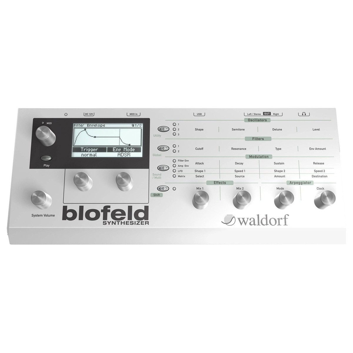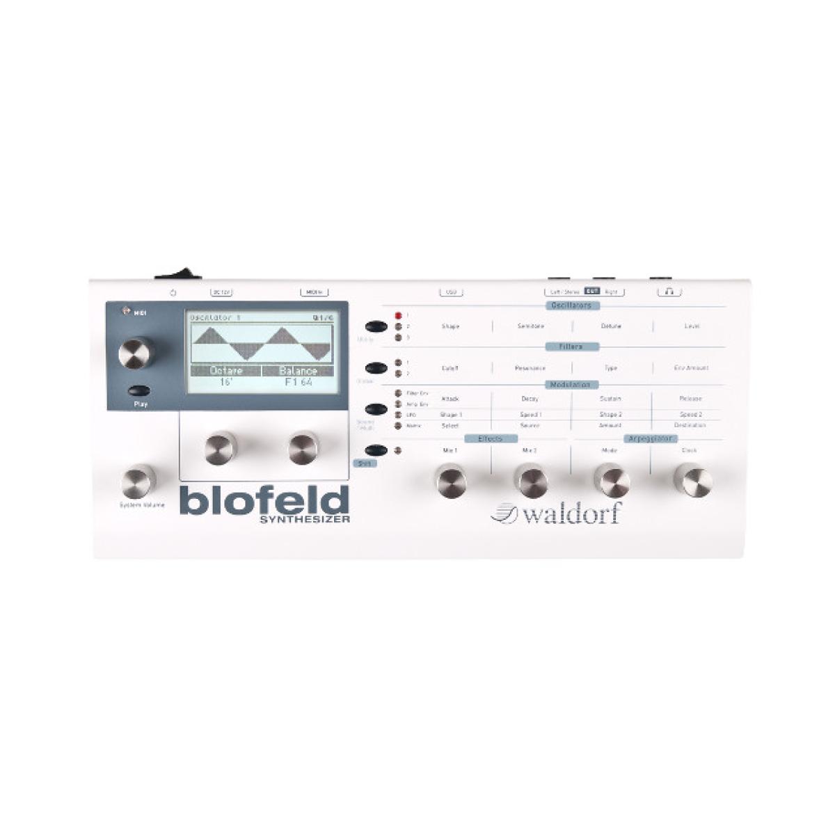 En el corazón del Waldorf Blofeld hay tres osciladores que están diseñados utilizando auténticos modelos de circuitos de osciladores analógicos. Se incluyen formas de onda de pulso con ancho de pulso variable, diente de sierra, triángulo y onda sinusoidal. Esta amplia selección de formas de onda analógicas le permite crear de todo natural, desde sonidos orgánicos hasta líneas de bajo agresivas y pads... El Blofeld es perfecto para crear timbres y sonidos complejos con su amplia gama de controles y diseño ergonómico.