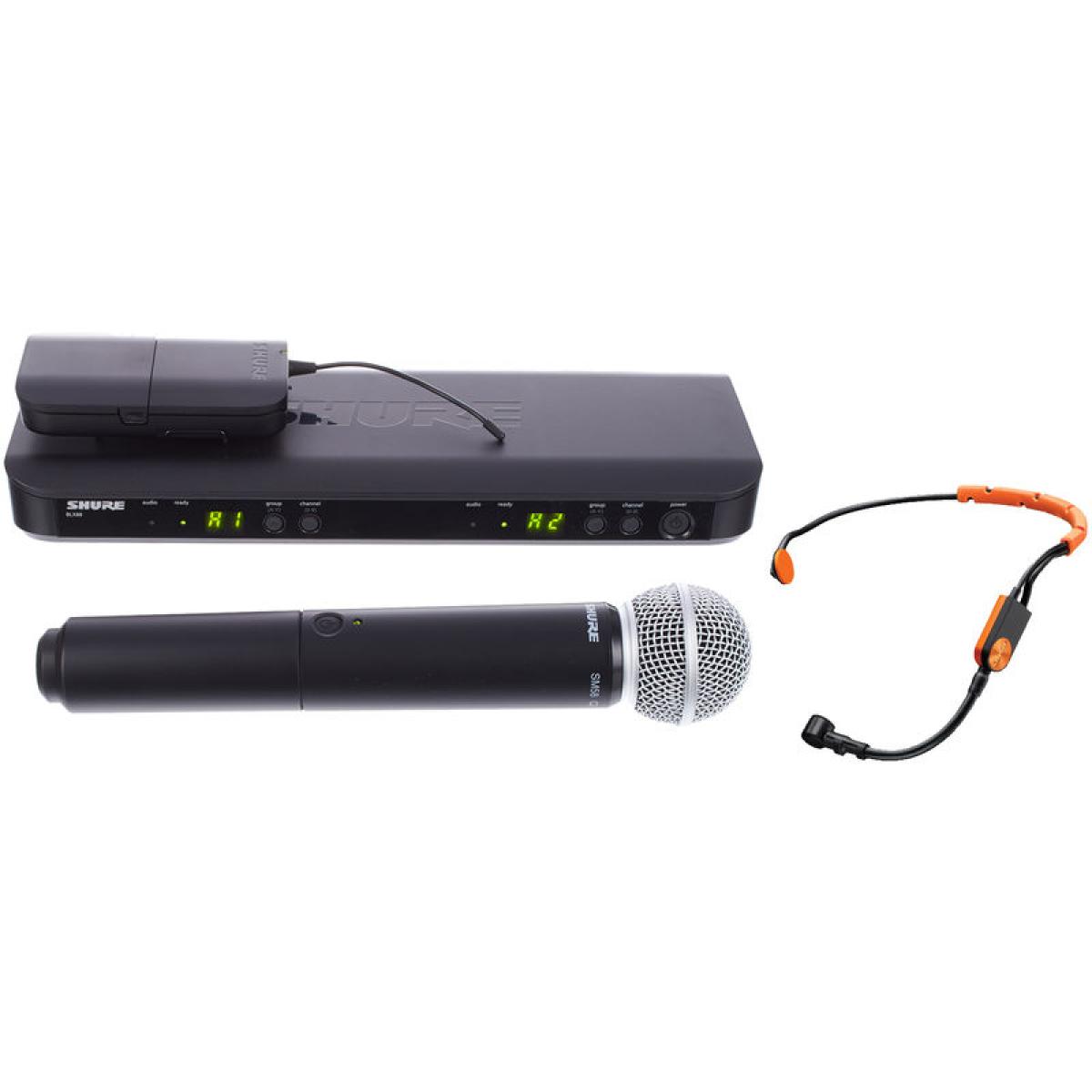 SM31FH, micrófonos SM58, receptor BLX4 y transmisor BLX1. Receptor compatible con hasta 12 canales grupales.