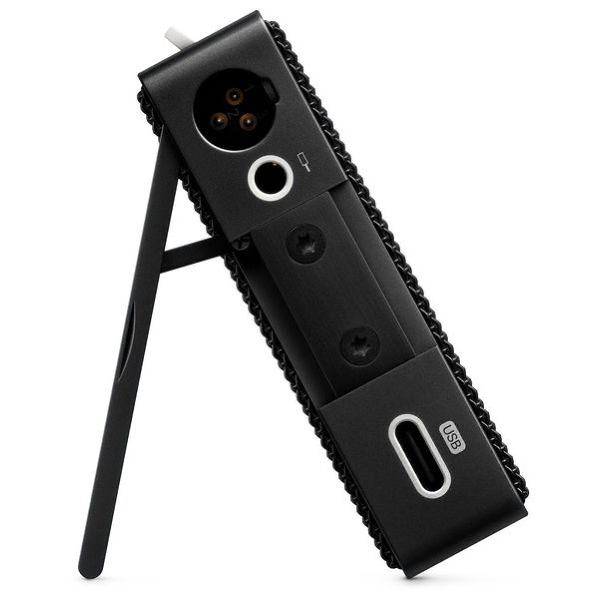 • Se puede utilizar de tres formas diferentes: como micrófono clásico a través de XLR (requiere alimentación fantasma de 48 V), como micrófono USB y como micrófono independiente con preamplificador integrado y salida de nivel de línea a través de un conector jack de 3,5 mm (alimentado por batería integrada) ;