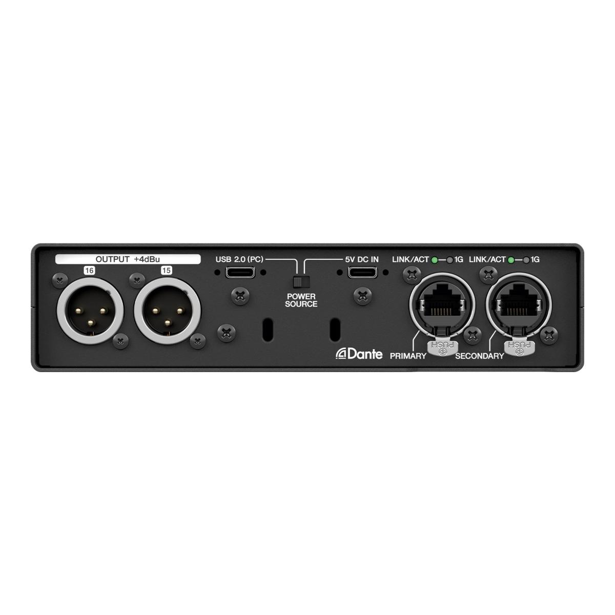 - Esta unidad cuenta con una variedad de conectores de entrada/salida y es útil en una amplia gama de situaciones, como la salida de audio procesado por computadora a un mezclador a través de Dante, la medición acústica y mucho más.