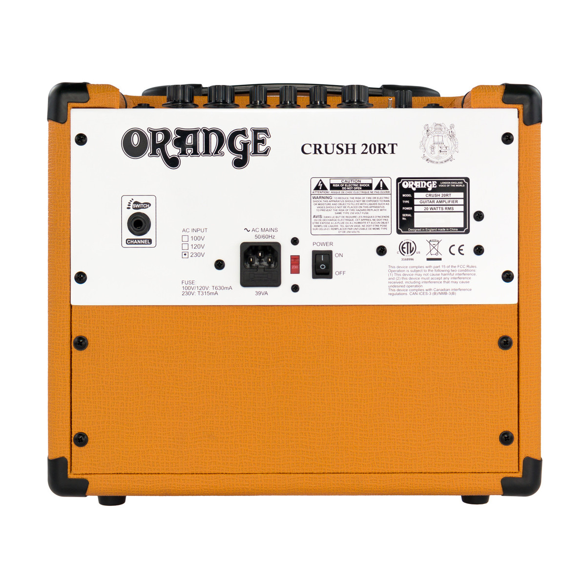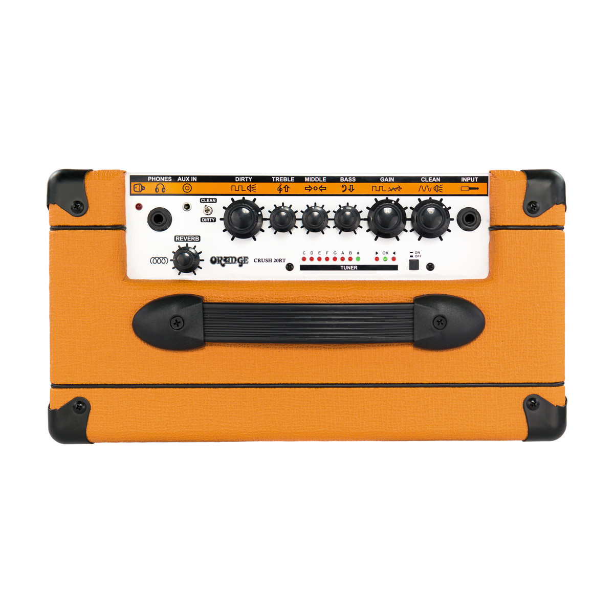 El combo de guitarra Orange Crush 20RT está inspirado por las características del Crush 20, pero con más funcionalidad gracias a la inclusión de una exuberante reverberación y un afinador cromático integrado. Como el Crush 20, este combo cuenta con canales Clean y Dirty intercambiables, la nueva ganancia de Orange, diseño de cuatro preamplificadores con una amplia variedad de sonidos y armonías de calidad. Su altavoz "Custom Voice of the World Speaker" de 8 pulgadas produce tonos increíbles con una potencia fantástica que sonará espectacular dondequiera que toques. Con una entrada AUX para tus pistas de acompañamiento y una salida de auriculares CabSim, el Crush 20RT un combo perfecto para prácticas que combina características como el legendario tono de Orange con otras características clásicas.