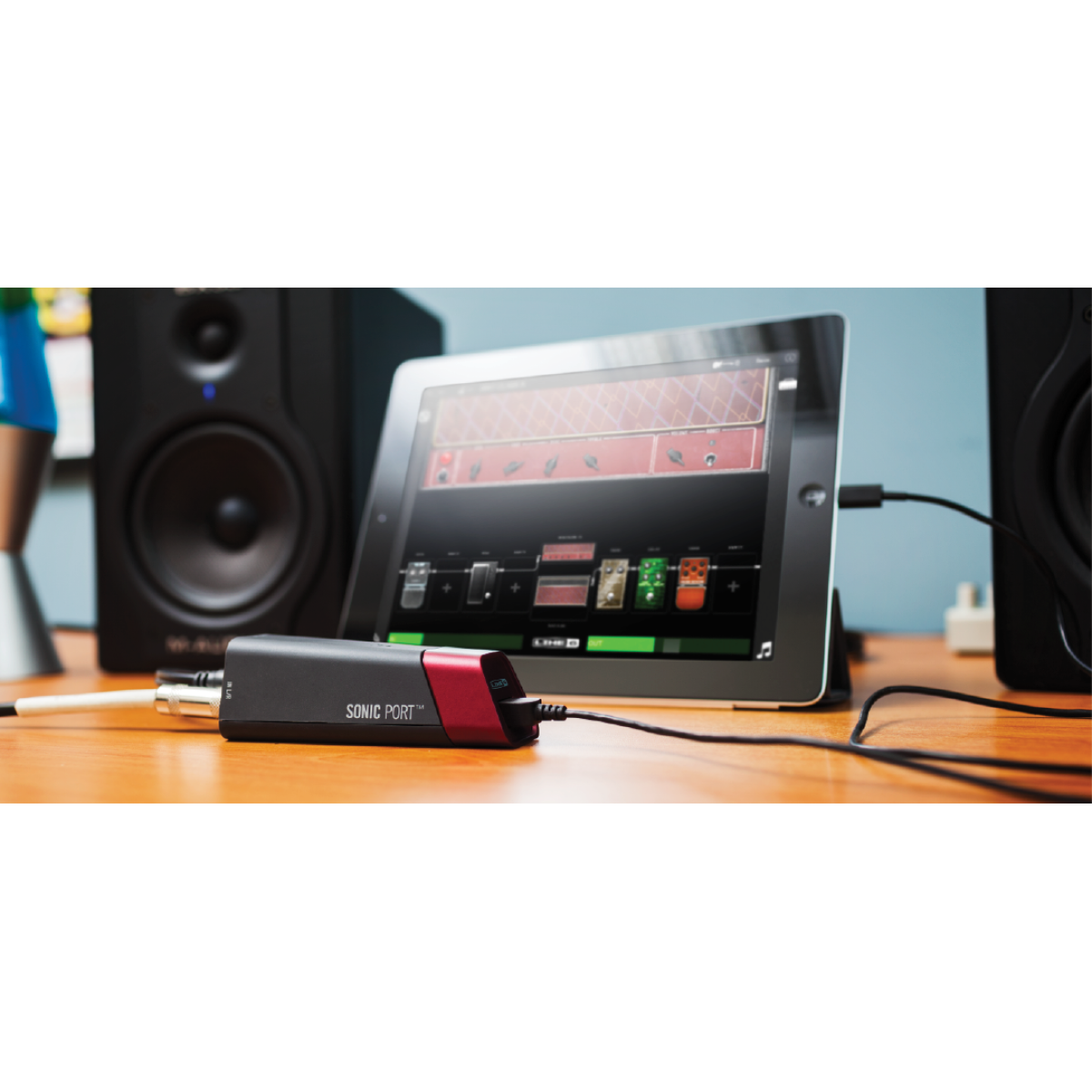 La Line 6 Sonic Port VX es una interfaz de audio con micrófonos incorporados que te permite crear grabaciones multipistas de calidad profesional en cualquier lugar. Sonic Port VX es una interfaz de grabación móvil que pone el poder de un estudio en tus manos allá donde vayas. Con micrófonos de condensador incorporados y preamplificadores que captan sonidos con impresionante claridad y dinámica, puedes finalmente desarrollar ideas y grabar canciones multipista completas cuando y donde quieras. GRATIS Aplicación Mobile POD que Proporciona Tonos de Guitarra POD