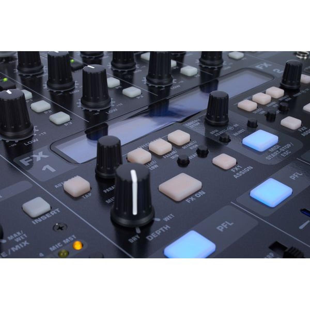 Más de 120 controles ofrecen un enorme número de funciones y opciones de ajuste. Especialmente los dos procesadores de efectos independientes con 9 efectos cada uno se pueden editar ampliamente y se pueden sincronizar con el tempo de la canción. El sampler integrado dispone de dos memorias para muestras de hasta 32 segundos, que se pueden mezclar en bucle o de una sola vez, hacia delante o hacia atrás. El mezclador también se puede utilizar como controlador MIDI a través de la salida MIDI - para programas como Traktor o Ableton Live ;