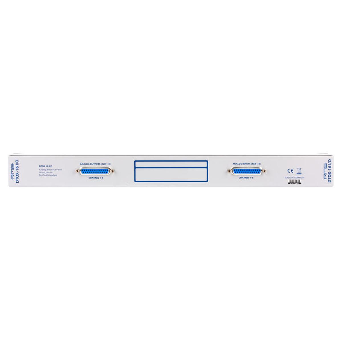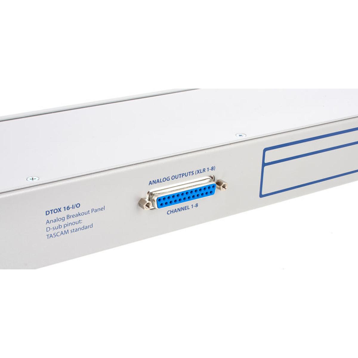 E / S RME DTOX-16 Consola de conexión universal para D-Sub 25 (analógica) 8 x XLR macho 8 x XLR hembra 2 x D-Sub 25 Diseño de clavijas: TASCAM Admite todas las interfaces con E / S D-Sub analógicas, así como las siguientes interfaces RME: ADI-8 QS, ADI-8 DS Mk III, M-32 AD, M-32 DA, M-16 AD, M-16 DAR Orejas de rack extraíbles Se pueden montar tanto en la parte delantera como trasera en el rack Formato: 19 "/ 1U