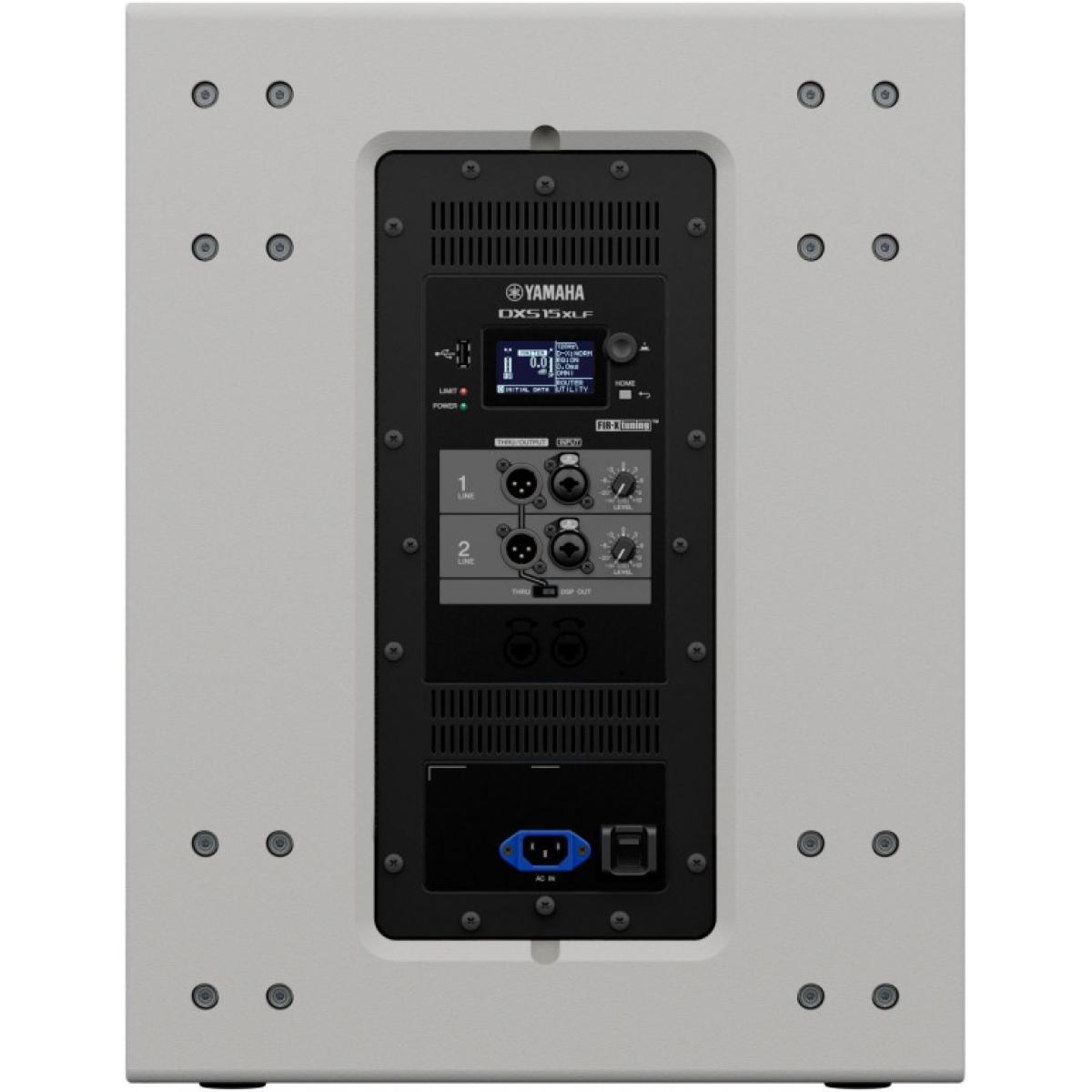 El panel trasero ofrece dos entradas combo XLR-1/4" con salidas/pasos XLR y controles de nivel dedicados. Un puerto USB permite la actualización del sistema y la configuración de preajustes y copias de seguridad. El Yamaha DXS15XLF se entrega con un cable de alimentación IEC estándar.