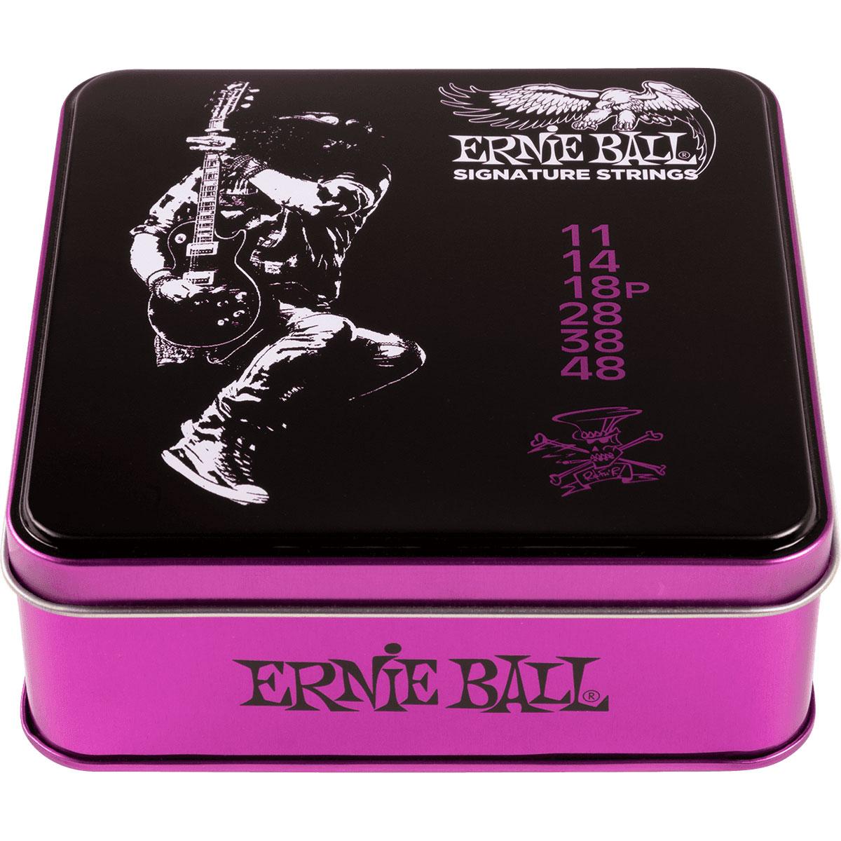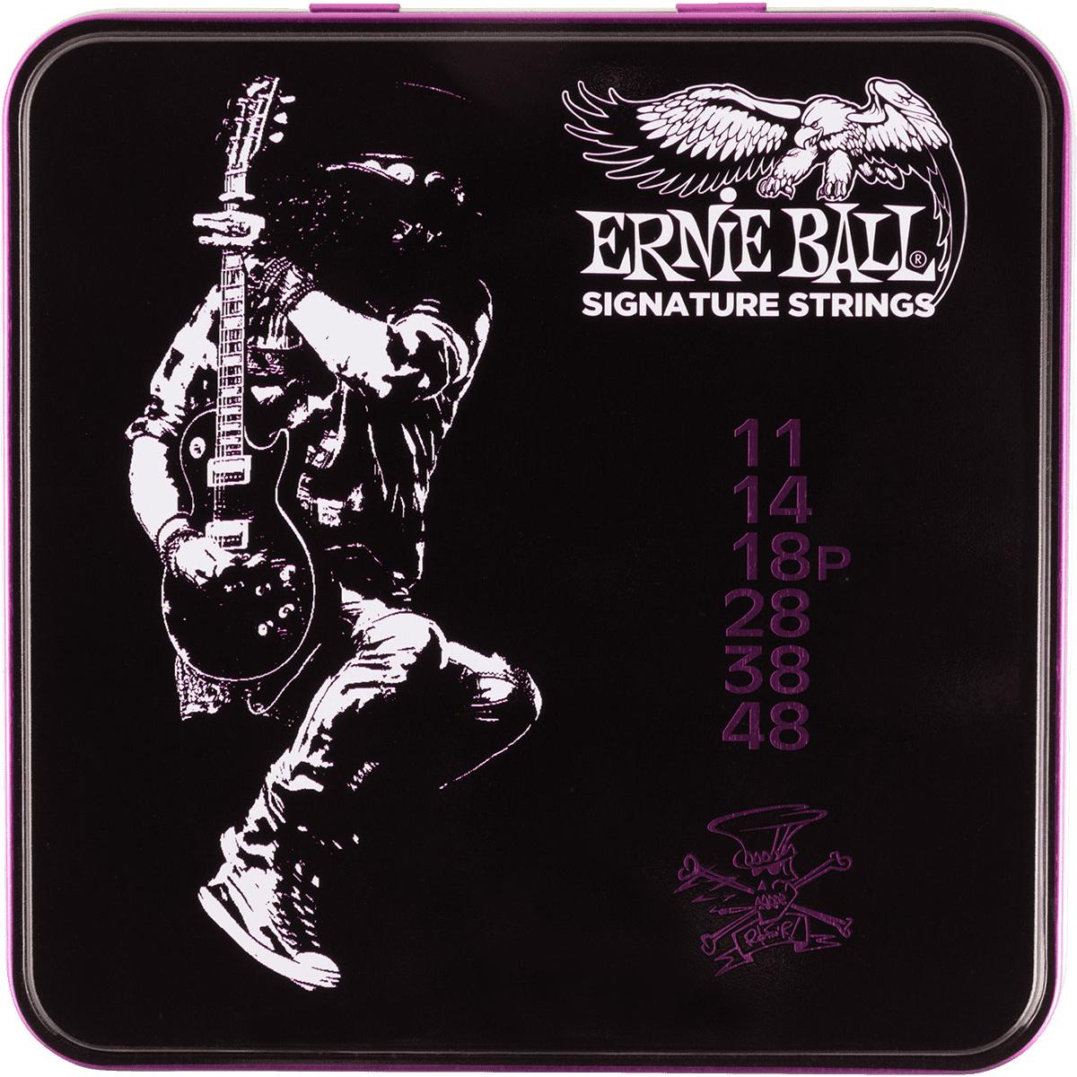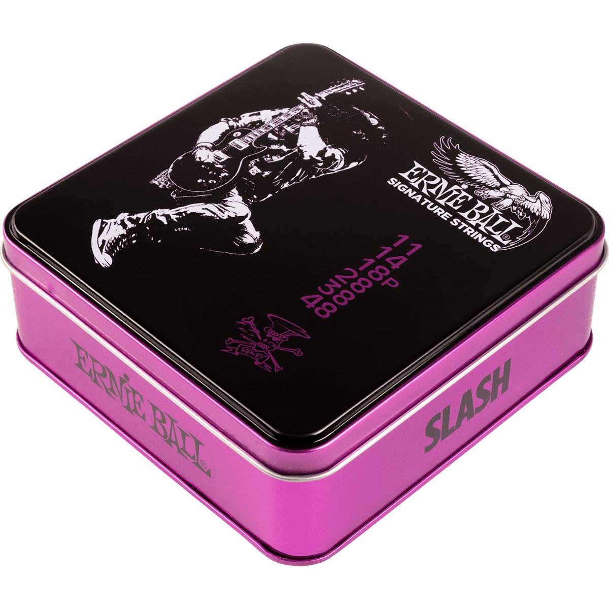 Ernie Ball presenta un juego de edición limitada de cuerdas Slinky exclusivas de Slash enrolladas personalizadas. Los nuevos conjuntos de cuerdas característicos de Slash son la culminación de más de tres décadas de la búsqueda continua de Slash y Ernie Ball para crear cuerdas que brinden más durabilidad y estabilidad de afinación sin sacrificar el tono o la sensación. Estos nuevos juegos consisten en sus Slinkys de calibre 11-48 preferidos enrollados con alambre central Paradigm y alambre envolvente de acero niquelado mejorado con plasma, mientras que las cuerdas planas Paradigm están construidas con un refuerzo de alambre de latón más pesado en cada uno de los extremos de la bola para una mejor estabilidad de afinación. y fuerza. Estos juegos de cuerdas de edición limitada son altamente coleccionables y están convenientemente empaquetados en una caja de hojalata en relieve de tres paquetes para un fácil almacenamiento.