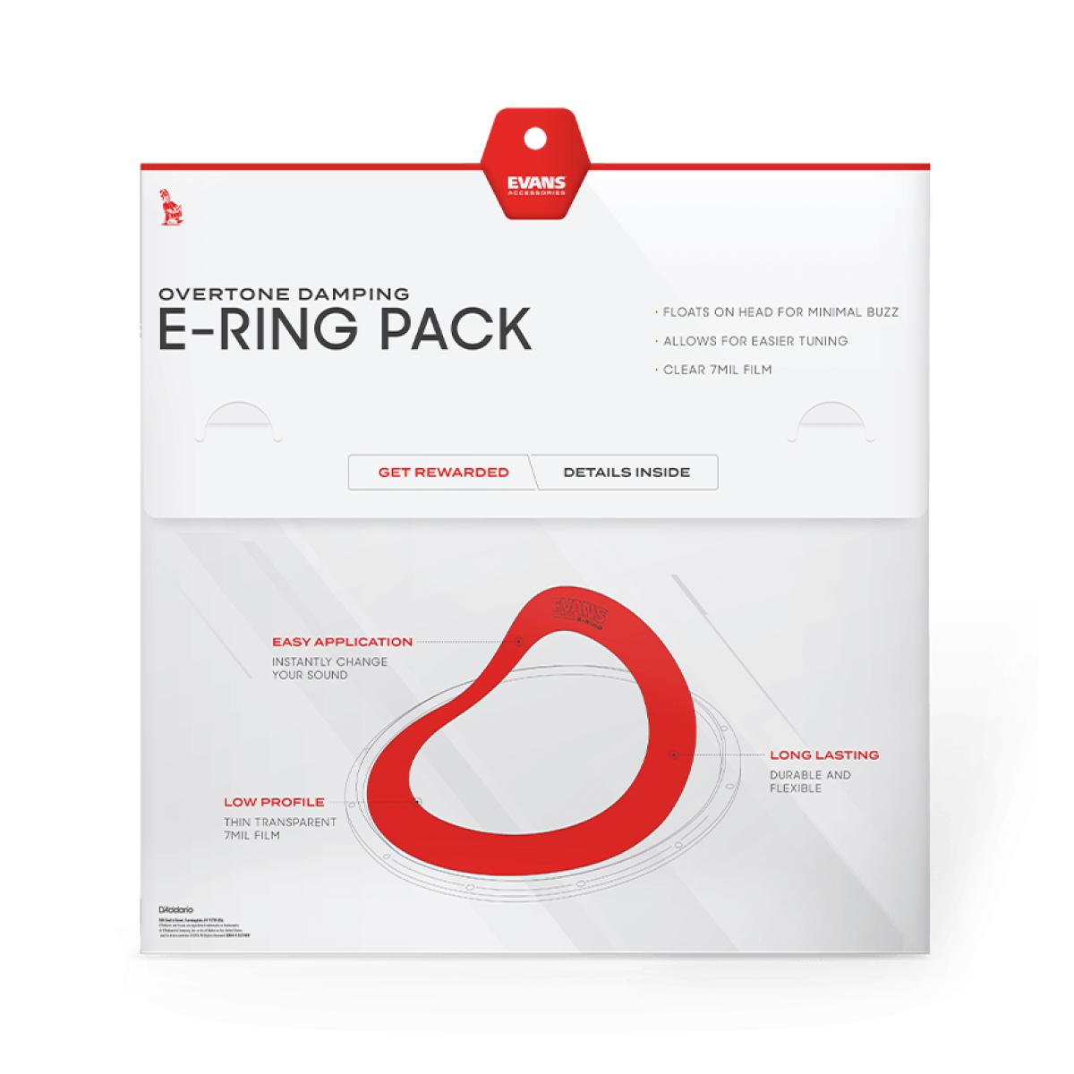 • Los EVANS E-Ring Packs contienen anillos de control de sobretonos externos fáciles de usar que "flotan" en la superficie de un parche de tambor para eliminar los sobretonos y aplanar el sonido del parche, lo que permite una afinación más fácil. ;