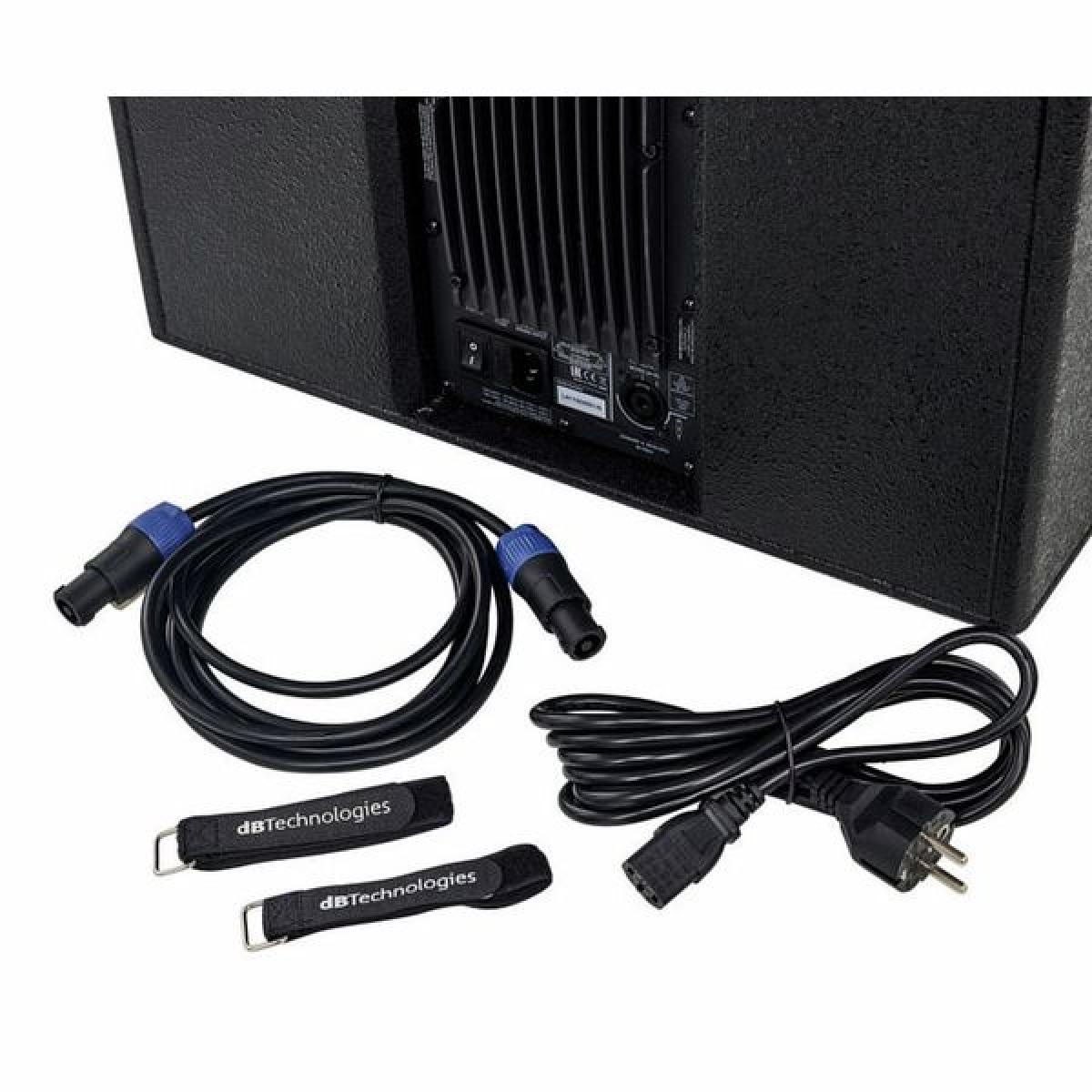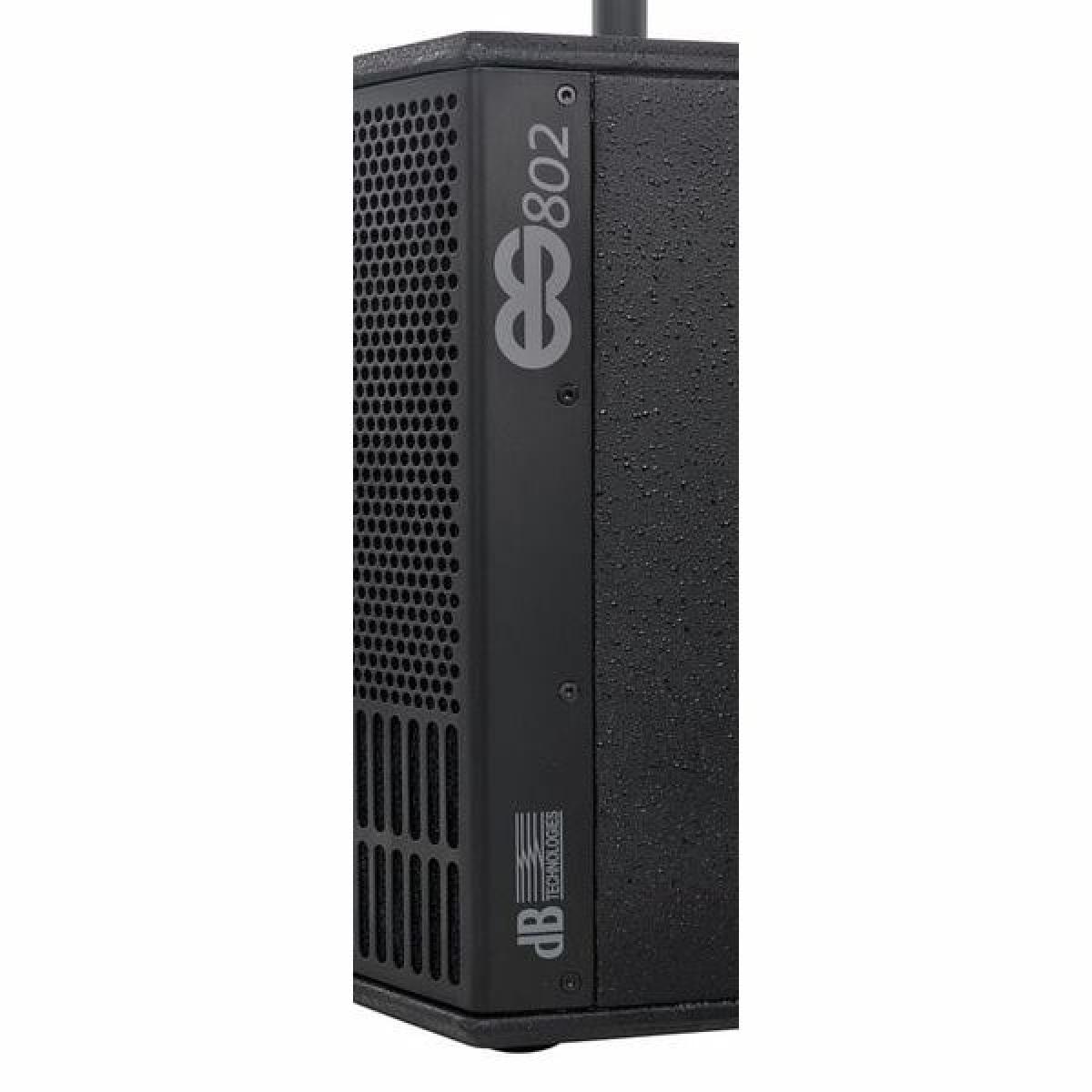 Sistema de sonido activo compacto dB Technologies ES802, compuesto por subwoofer y dos altavoces satélite, ideal para aplicaciones de sonido en directo, DJ, eventos e instalaciones móviles.