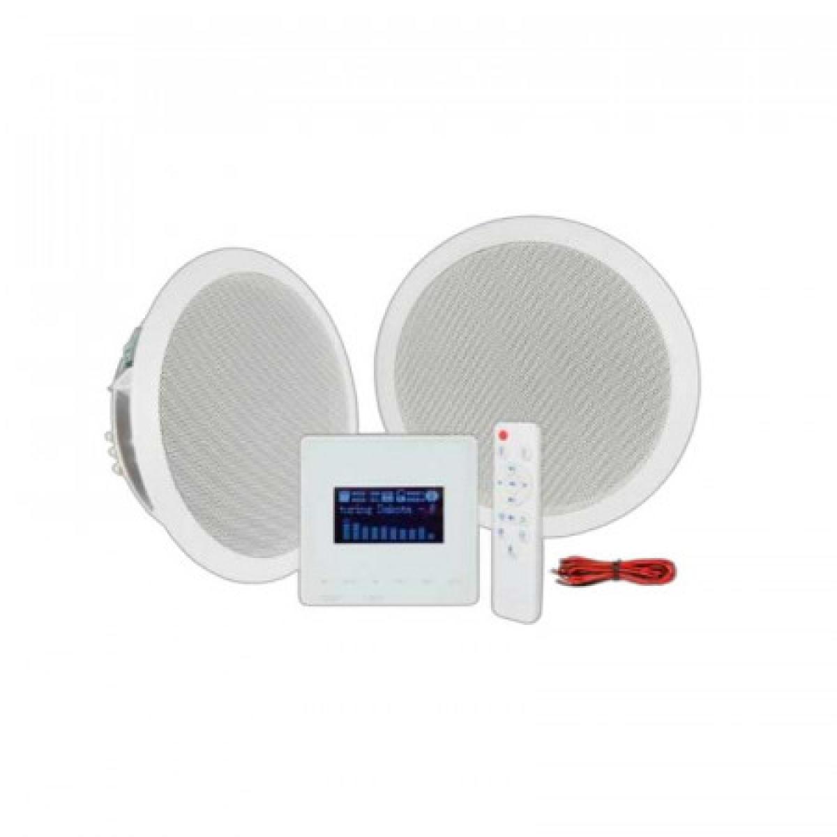 Amplificador reproductor para instalación en pared con dos altavoces de 6,5" para empotrar en techo o pared con 2 x 15W de potencia de salida con una conectividad muy completa que incluye puerto USB, ranura para tarjetas microSD, reproductor de radio FM y conexión inalámbrica vía Bluetooth Incluye mando a distancia.