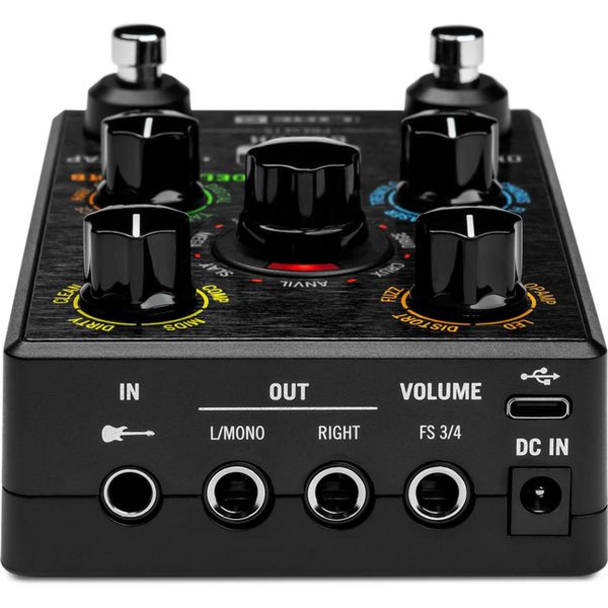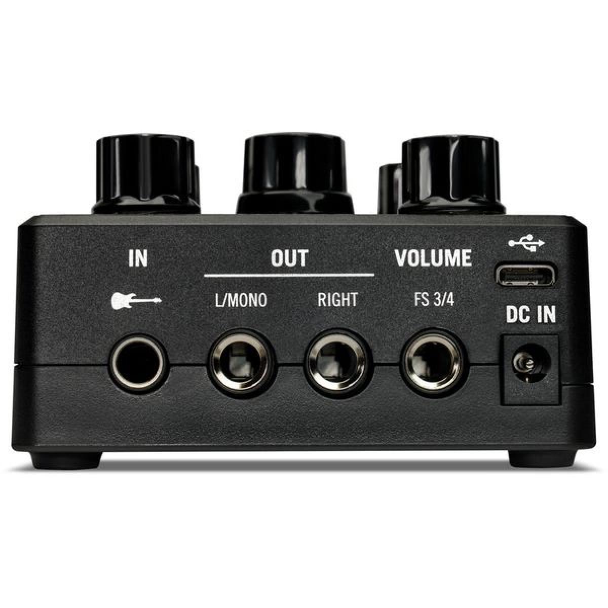 • Conexiones: Entrada (jack de 6,3 mm), salidas estéreo (jack de 6,3 mm / L para mono), conexión para auriculares estéreo (jack de 3,5 mm), conexión para pedalera opcional, USB-C, control de volumen para conexión de auriculares;