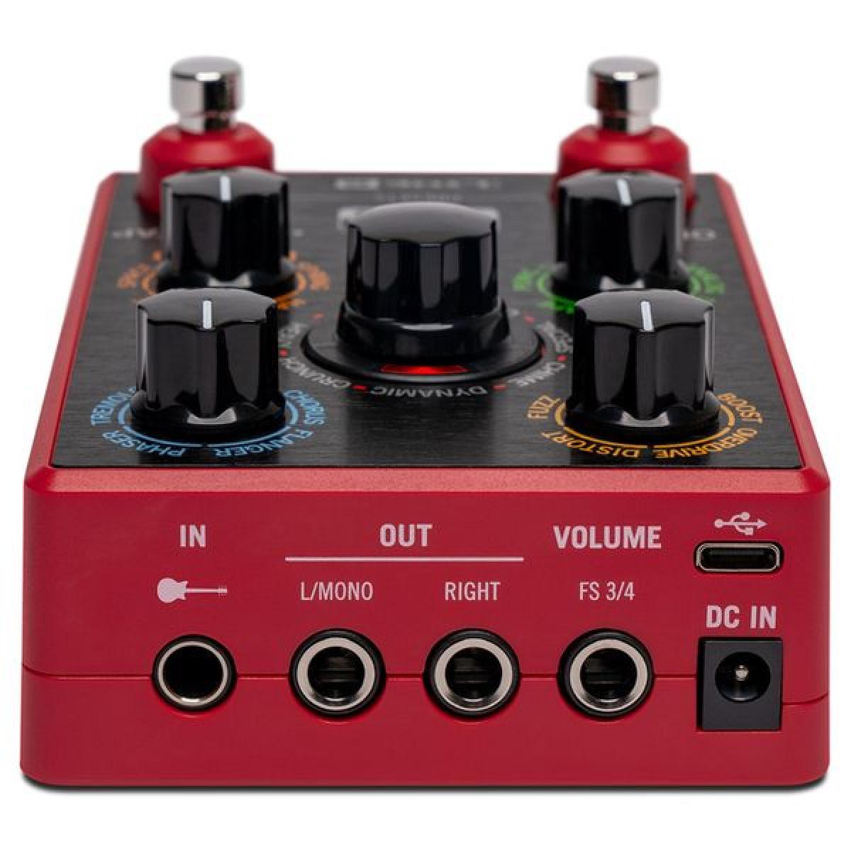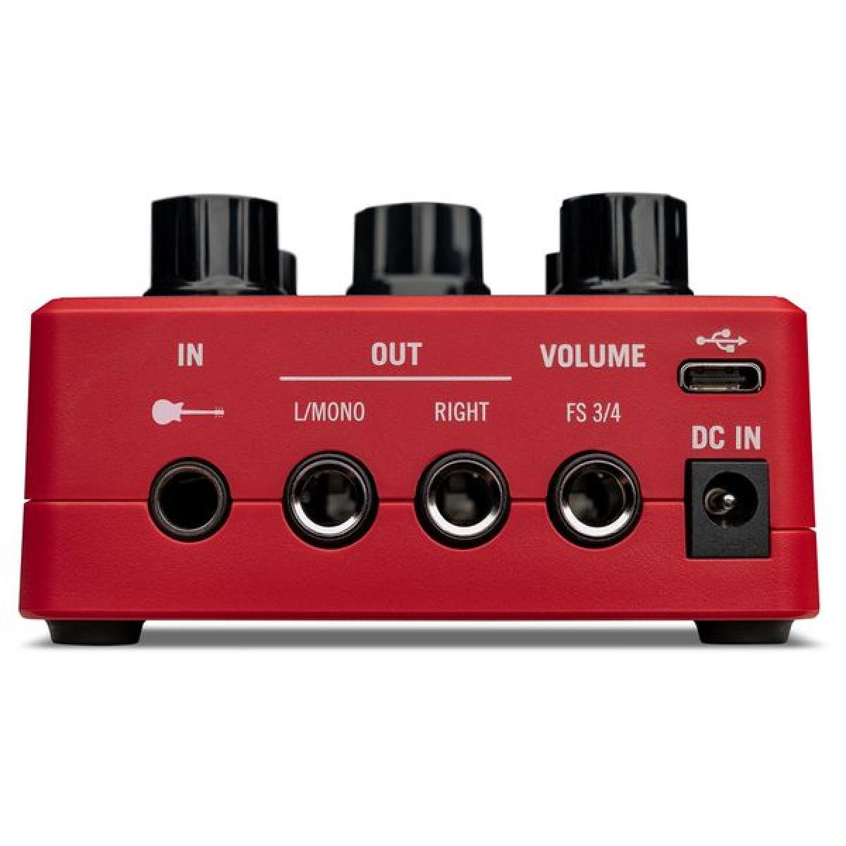 • conexiones: Entrada (jack de 6,3 mm), salidas estéreo (jack de 6,3 mm / L para mono), conexión para auriculares estéreo (jack de 3,5 mm), conexión para pedalera opcional, USB-C, control de volumen para conexión de auriculares;