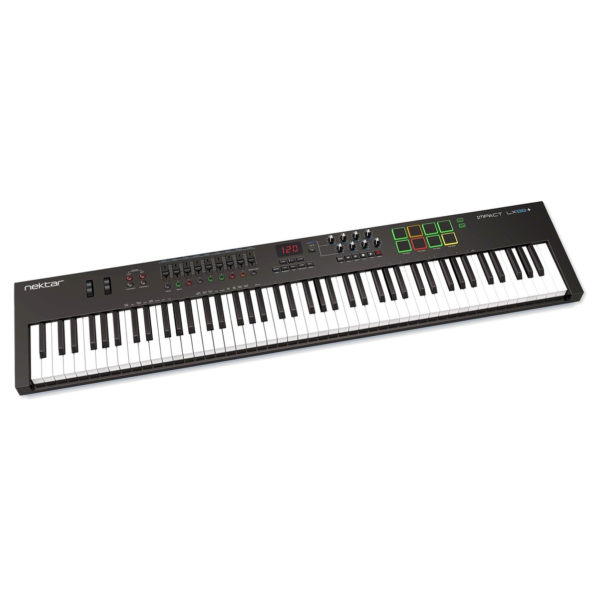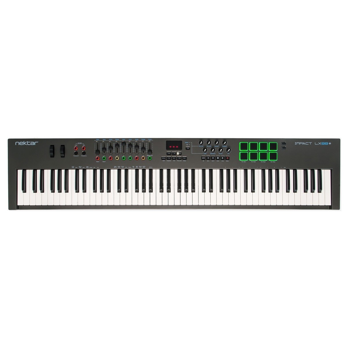 El Nektar Impact LX88+ es un teclado MIDI de 88 teclas, sensible a la velocidad, con 8 LEDs iluminados, sensible a la velocidad pads. El Nektar Impact LX88+ presenta una gama de parámetros y controles para mejorar su flujo de trabajo como músico digital. El teclado sensible a la velocidad aumenta la capacidad de tocar el teclado, proporcionando una sensación natural y fluida al mismo tiempo que reproduce una amplia gama de sonidos diferentes. Los 8 sensibles pads a la velocidad se pueden utilizar para activar todo, desde sampling vocales de un solo disparo para live actuaciones hasta sampling de instrumentos rebanados para la producción musical. El Impact LX88+ también cuenta con controles de transporte que mejoran la integración y el flujo de trabajo. También incluye todos los controles y parámetros estándar que cabría esperar, incluyendo una rueda de afinación y modulación, así como nuevas adiciones como los nueve reguladors de 30 mm. Alimentado por USB y sin necesidad de controladores adicionales, el Nektar Impact LX88+ puede configurarse y reproducirse en cuestión de minutos.