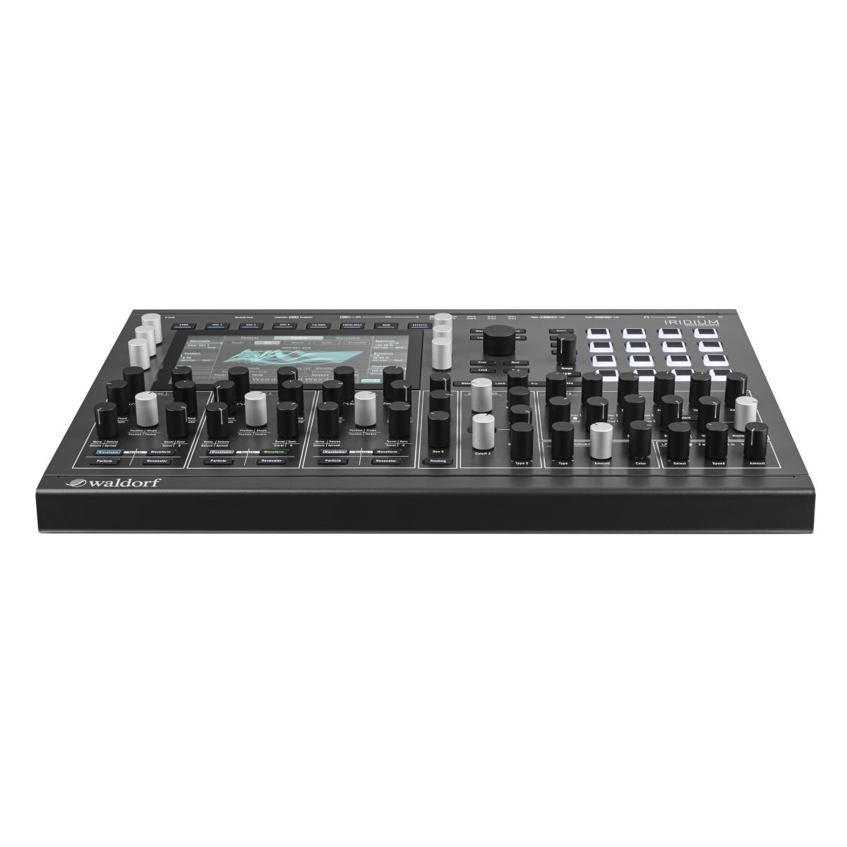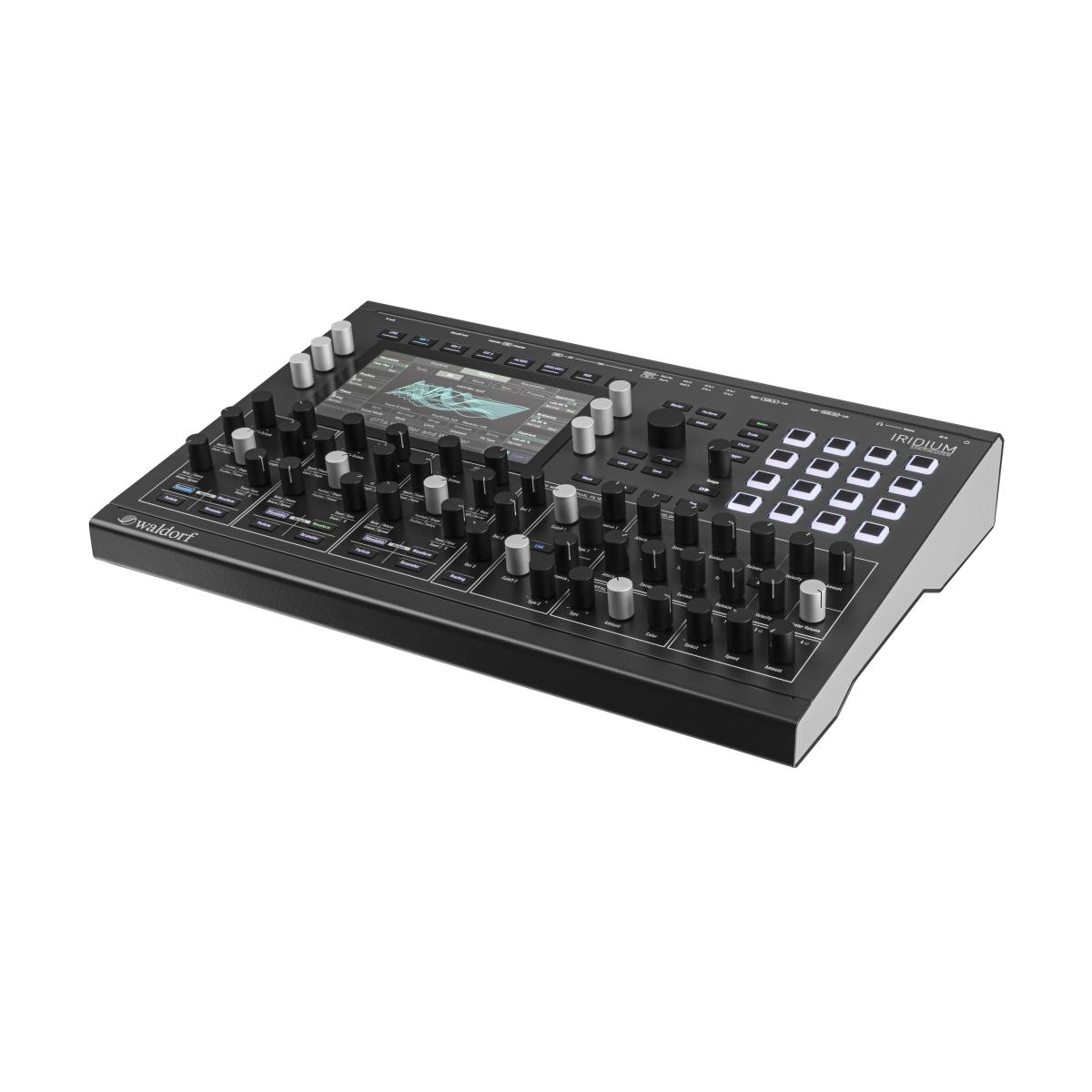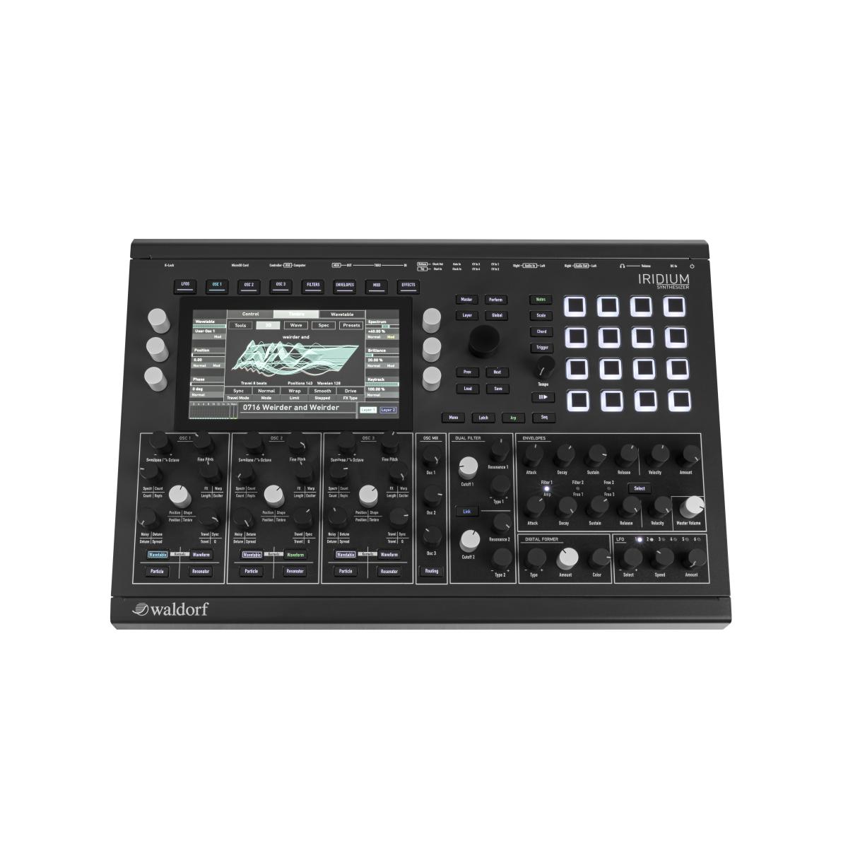 Especificaciones Waldorf Iridium Desktop Polifonía de 16 voces, dúo-timbre Compatible con el motor de sintetizador Waldorf Quantum 3 Osciladores Modos de oscilador: Tabla de ondas Forma de onda (VA) Partícula (muestreo y muestreo granular) ResonatorKernels (hasta 6 subosciladores que se pueden interconectar a través de FM a una velocidad de audio) 3 estéreo Filtros por voz Ruta estéreo real Filtro digital dual: Dos filtros con modos independientes 12 / 24dB LP / HP / BP en todas las combinaciones Modelos Naave, Largo, PPG, Quantum y StateVariable Formador digital: Modelos de filtro de Waldorf Nave, Largo y PPG en HP / LP / BP / NotchComb filter BitcrusherDriveRingModState Modo variable El analizador se muestra en la vista de filtro La curva de filtro se mueve cuando se modula (opcional) Opciones de enrutamiento de filtro sofisticadas con panoramización y niveles modulables Moduladores: 6 envolventes 6 LFO Modulador Komplex (combinación de LFO / envolvente con forma definida por el usuario) Modo de control adicional Matriz de 40 ranuras cantidad por ranura Las fuentes y destinos idénticos se pueden utilizar varias veces hasta La matriz está completa Pads: matriz de almohadilla de silicona 4x4 con retroiluminación RGB Los pads pueden reproducir notas, acordes, arpegios y secuencias Modo de bloqueo Funciones de interpretación: Arpegiador Secuenciador de pasos con hasta 32 pasos para notas y parámetros Pantalla de favoritos para recuperar rápidamente el parche Rueda de modificación en pantalla, Pitch Bend y Pantalla de aftertouch : Parches de pantalla táctil de alta capacidad de respuesta de grado industrial: Más de 1000 sonidos de fábrica Capacidad de 7000 ranuras de memoria de parche (se pueden usar números 0000-9999) Se pueden cargar parches de Quantum y viceversa Filtro de categoría para la lista de parches Memoria flash de muestra de usuario de 2GB Conexiones: 2x TS Salida 2x Entrada TS Salida de auriculares con control de ganancia Entrada / Salida MIDI DIN / A través de USB MIDI Host USB para dispositivos de almacenamiento y MIDI Ranura MicroSD Bloqueo Kensington® Conexiones CV: 4 entradas CV más Gate In, Trigger In, Clock In, Clock Out Las entradas se pueden utilizar como fuentes de modulación en el Mod Matrix en general: caja de metal resistente con perillas de aluminio Dimensiones: 440 mm de ancho por 305 mm de profundidad por 85 mm de altura (controles incluidos) Peso: 5.4 kg Rack de 19 " piezas de montaje disponibles en un futuro próximo
