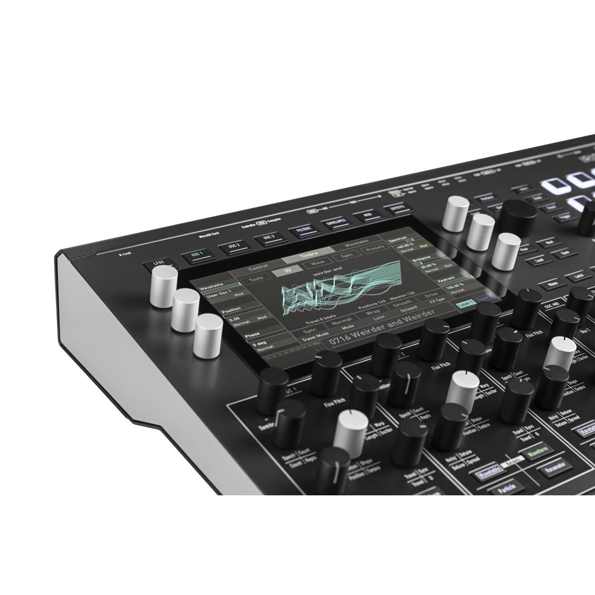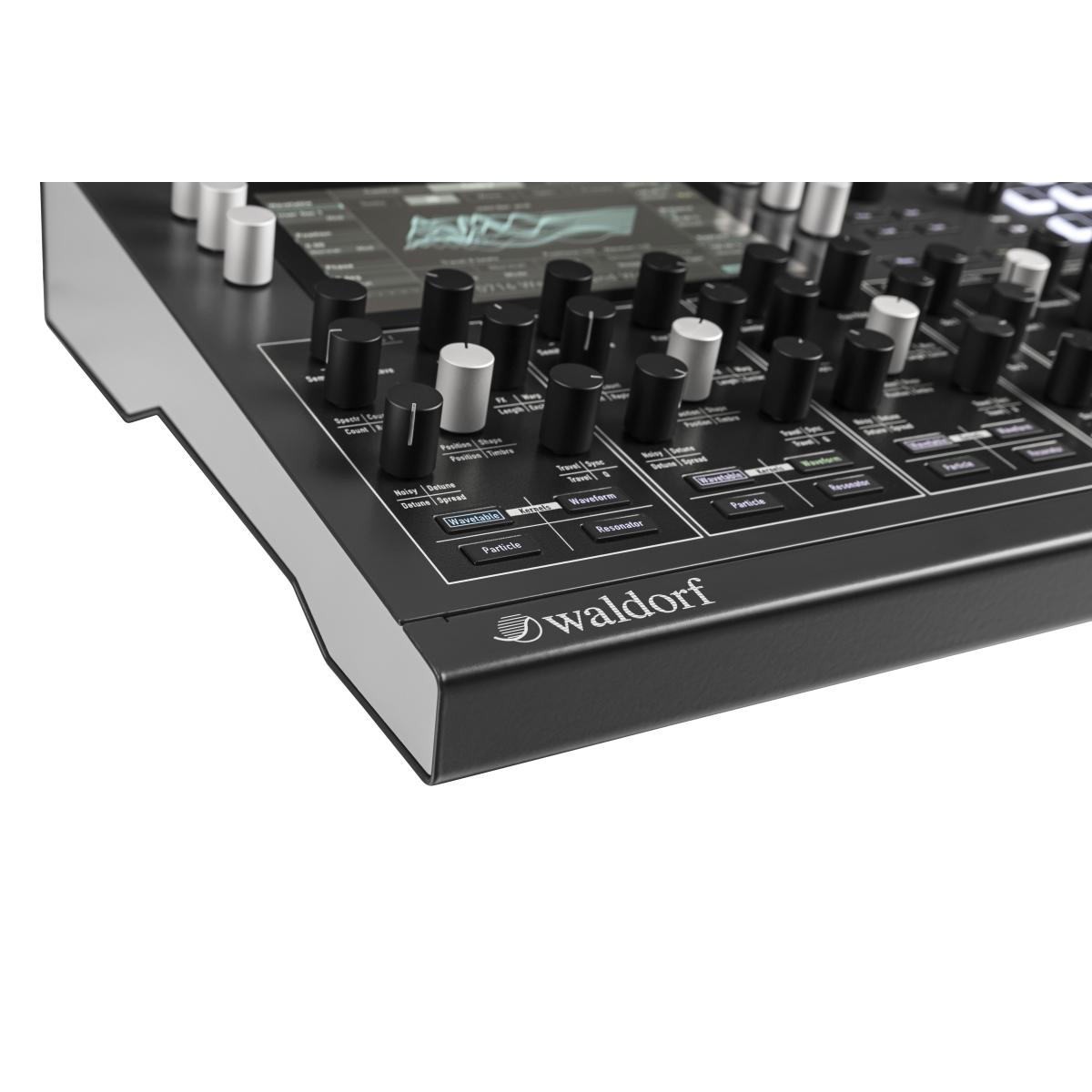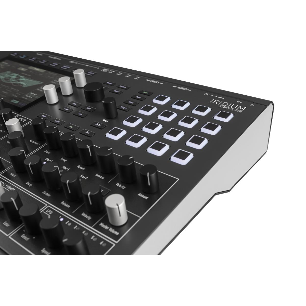 Especificaciones Waldorf Iridium Desktop Polifonía de 16 voces, dúo-timbre Compatible con el motor de sintetizador Waldorf Quantum 3 Osciladores Modos de oscilador: Tabla de ondas Forma de onda (VA) Partícula (muestreo y muestreo granular) ResonatorKernels (hasta 6 subosciladores que se pueden interconectar a través de FM a una velocidad de audio) 3 estéreo Filtros por voz Ruta estéreo real Filtro digital dual: Dos filtros con modos independientes 12 / 24dB LP / HP / BP en todas las combinaciones Modelos Naave, Largo, PPG, Quantum y StateVariable Formador digital: Modelos de filtro de Waldorf Nave, Largo y PPG en HP / LP / BP / NotchComb filter BitcrusherDriveRingModState Modo variable El analizador se muestra en la vista de filtro La curva de filtro se mueve cuando se modula (opcional) Opciones de enrutamiento de filtro sofisticadas con panoramización y niveles modulables Moduladores: 6 envolventes 6 LFO Modulador Komplex (combinación de LFO / envolvente con forma definida por el usuario) Modo de control adicional Matriz de 40 ranuras cantidad por ranura Las fuentes y destinos idénticos se pueden utilizar varias veces hasta La matriz está completa Pads: matriz de almohadilla de silicona 4x4 con retroiluminación RGB Los pads pueden reproducir notas, acordes, arpegios y secuencias Modo de bloqueo Funciones de interpretación: Arpegiador Secuenciador de pasos con hasta 32 pasos para notas y parámetros Pantalla de favoritos para recuperar rápidamente el parche Rueda de modificación en pantalla, Pitch Bend y Pantalla de aftertouch : Parches de pantalla táctil de alta capacidad de respuesta de grado industrial: Más de 1000 sonidos de fábrica Capacidad de 7000 ranuras de memoria de parche (se pueden usar números 0000-9999) Se pueden cargar parches de Quantum y viceversa Filtro de categoría para la lista de parches Memoria flash de muestra de usuario de 2GB Conexiones: 2x TS Salida 2x Entrada TS Salida de auriculares con control de ganancia Entrada / Salida MIDI DIN / A través de USB MIDI Host USB para dispositivos de almacenamiento y MIDI Ranura MicroSD Bloqueo Kensington® Conexiones CV: 4 entradas CV más Gate In, Trigger In, Clock In, Clock Out Las entradas se pueden utilizar como fuentes de modulación en el Mod Matrix en general: caja de metal resistente con perillas de aluminio Dimensiones: 440 mm de ancho por 305 mm de profundidad por 85 mm de altura (controles incluidos) Peso: 5.4 kg Rack de 19 " piezas de montaje disponibles en un futuro próximo
