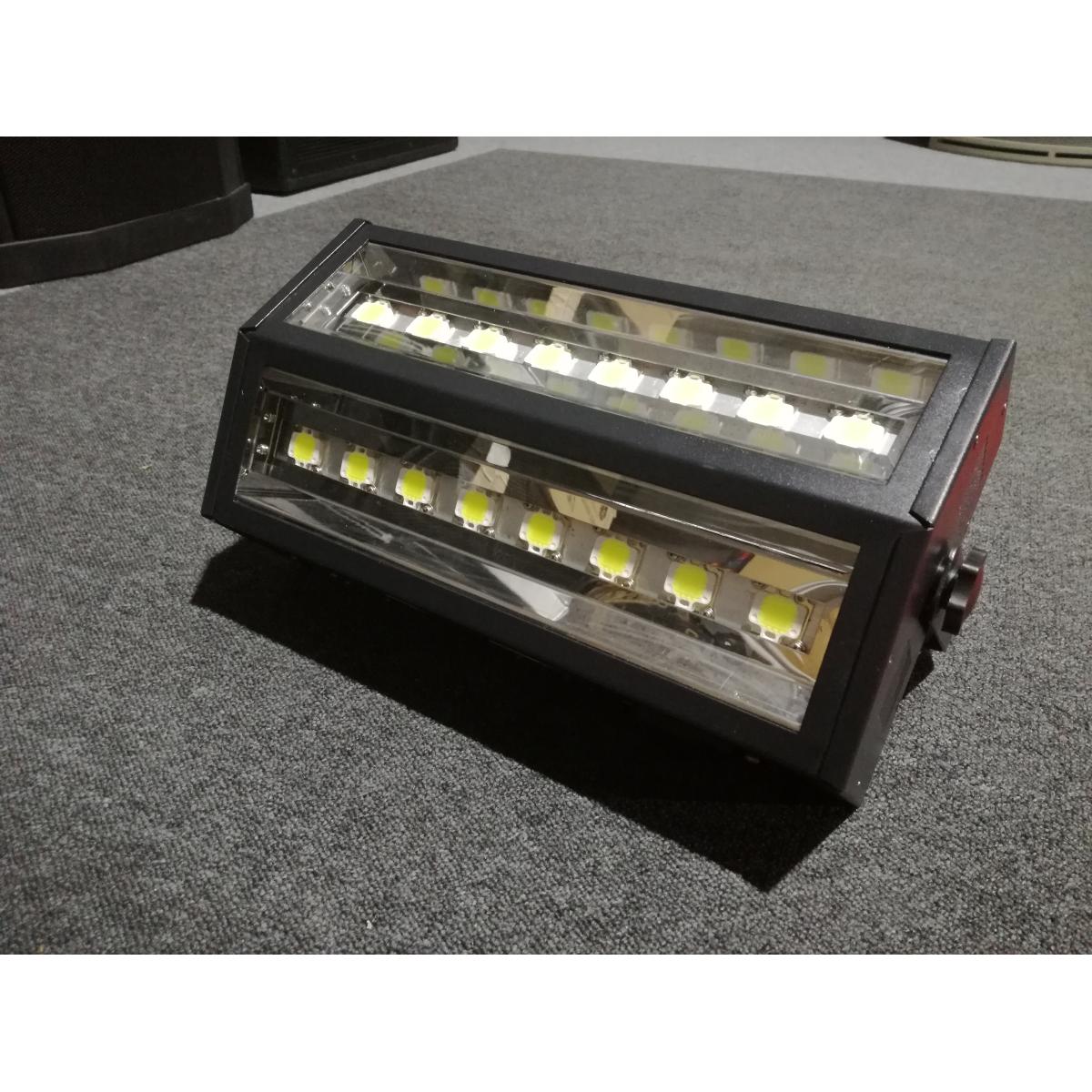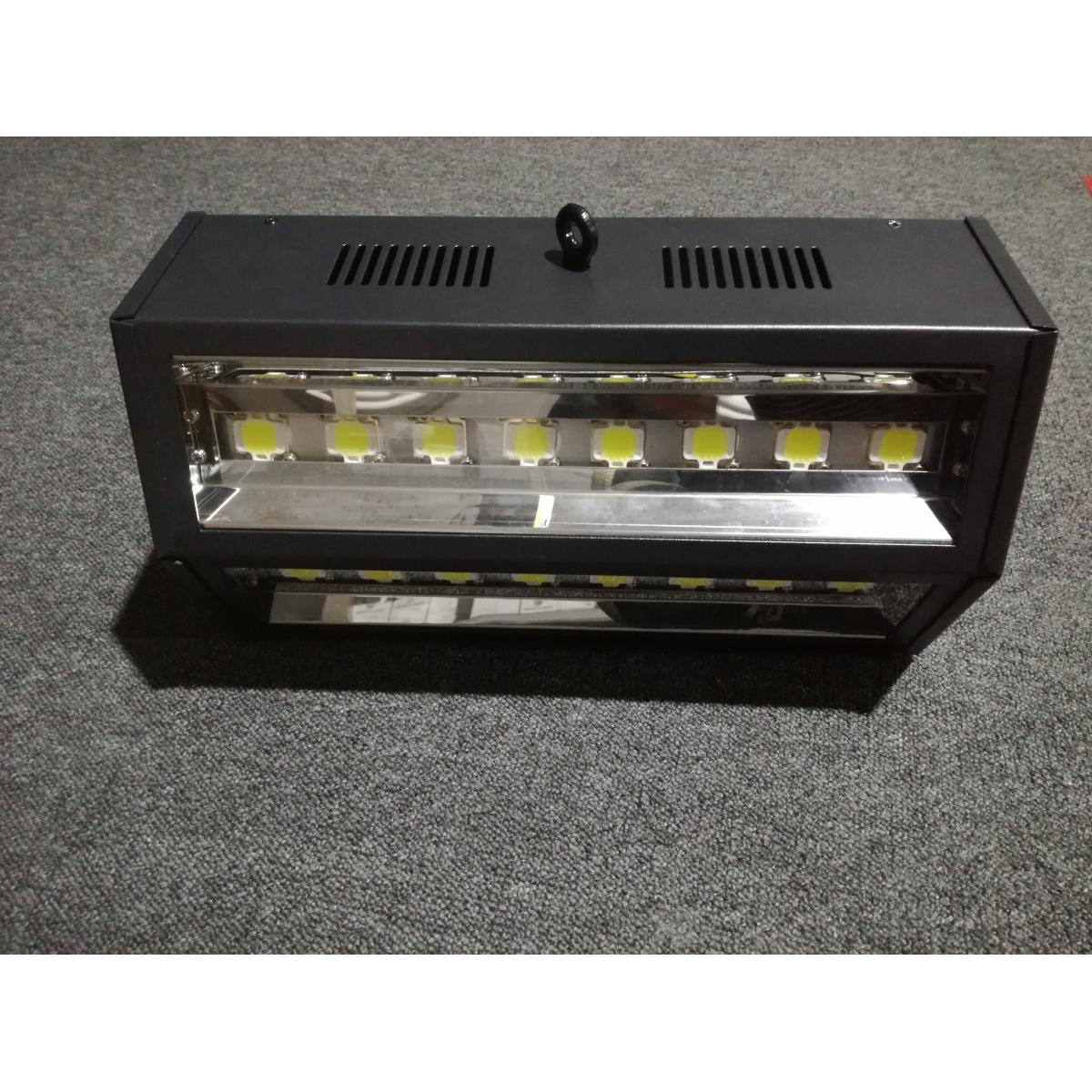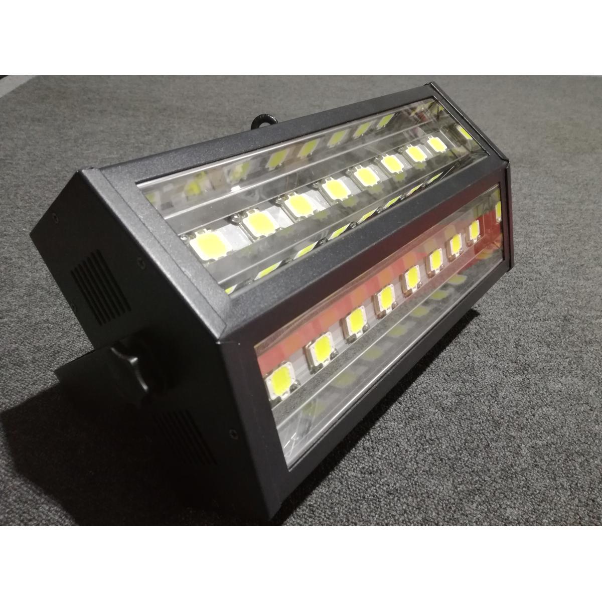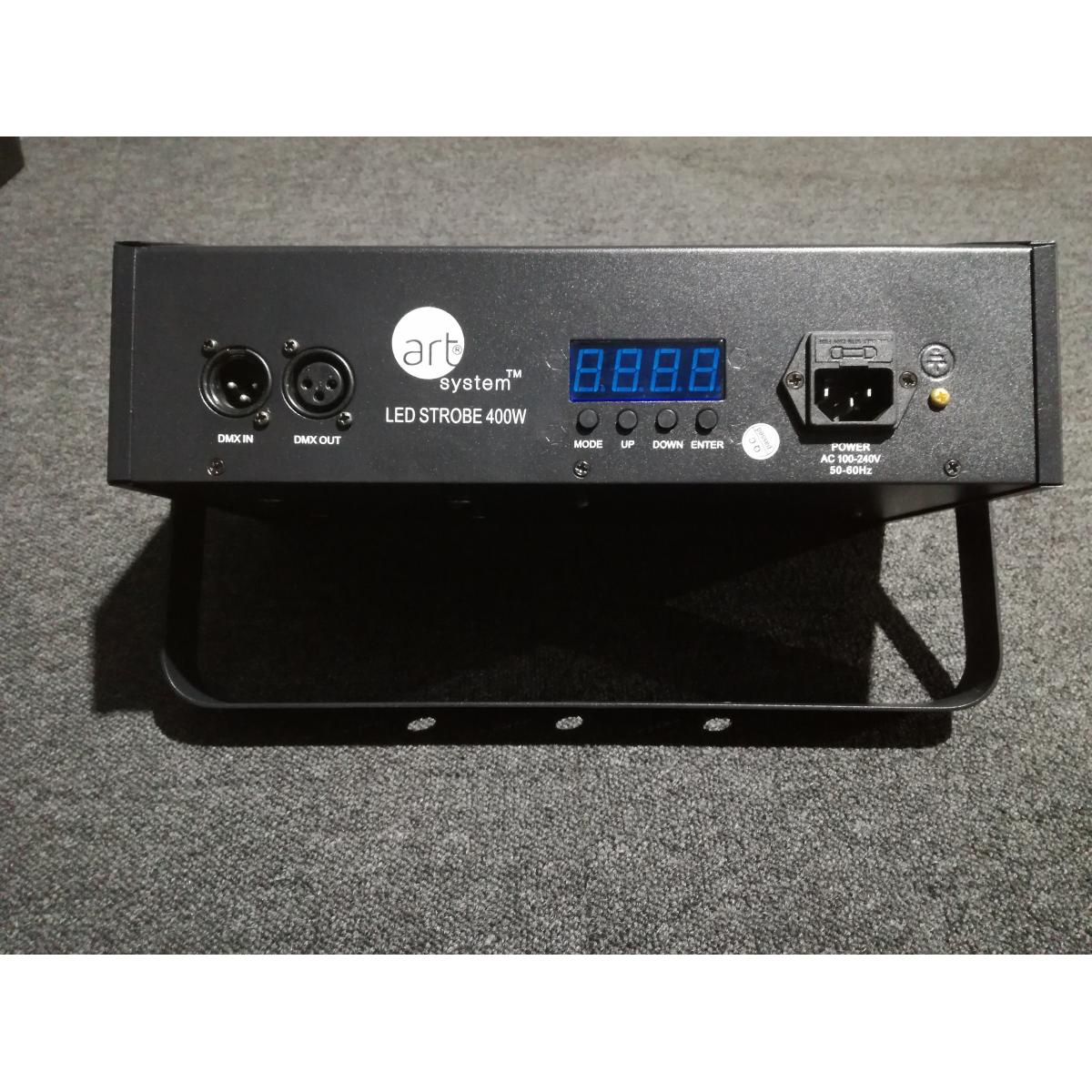 Estroboscopio LED de 400W con sensibilidad sonora y control vía DMX. Con DMX es posible controlar la intensidad y la velocidad del flash.