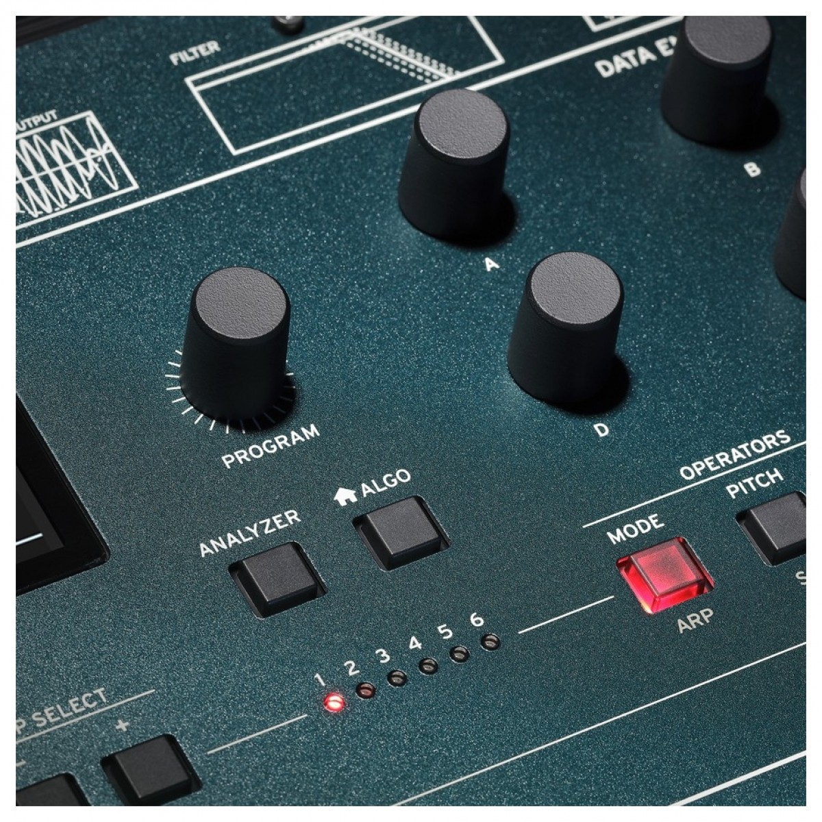 Estructura: 6 operadores, 1 filtro, 3 EG, 3 LFO, 3 efectos, secuenciador por pasos, arpegiador