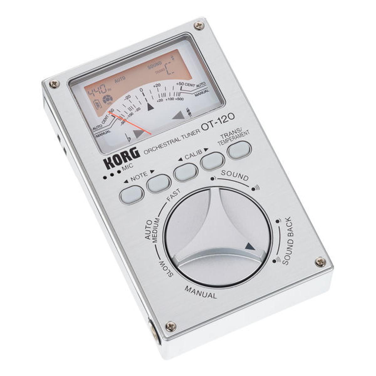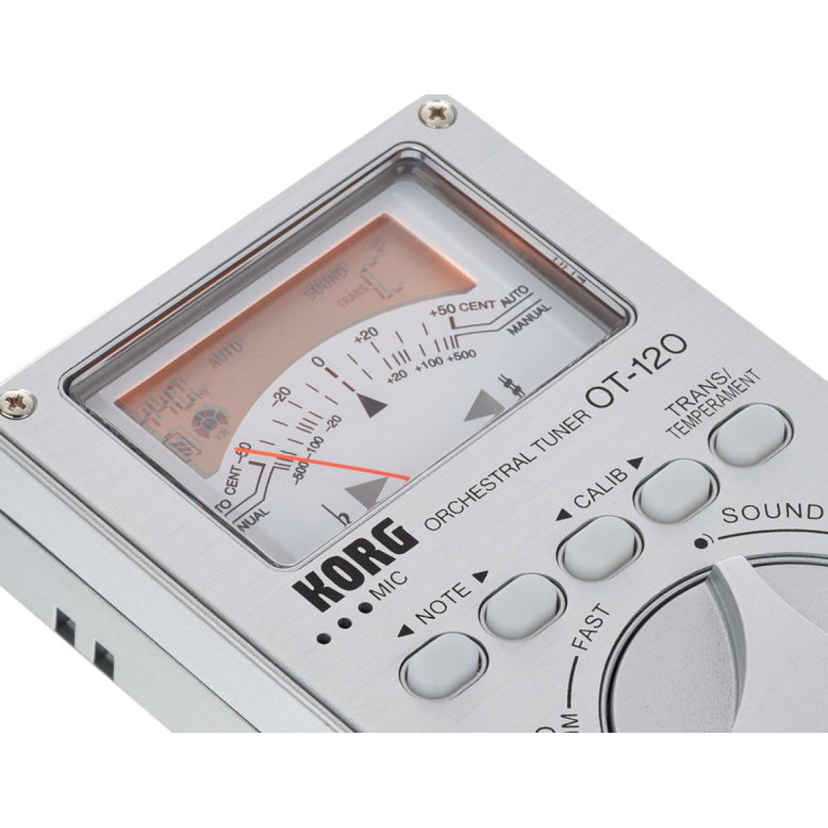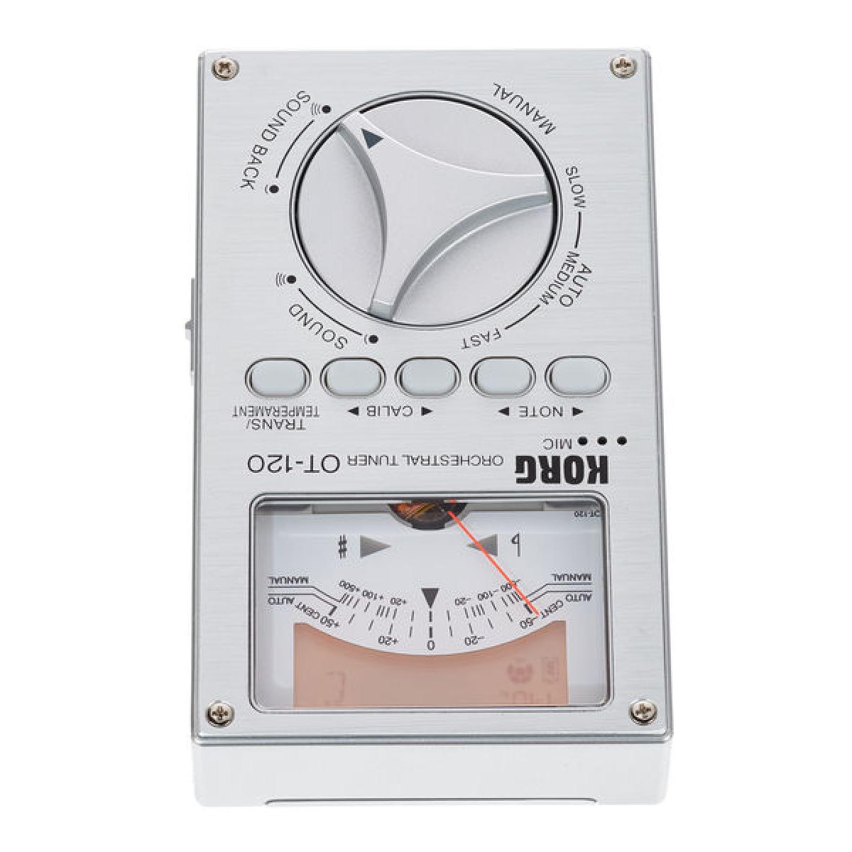 El OT-120 le permite afinar rápidamente cualquier tipo de instrumento de la banda, incluyendo orquesta, viento, cuerda, metal o piano, con su amplia tuning gama que va desde A0 hasta C8. El Korg OT-120 proporciona una amplia gama de calibración para soportar tonos de concierto en un rango de 349-499 Hz (pasos de 1 Hz).