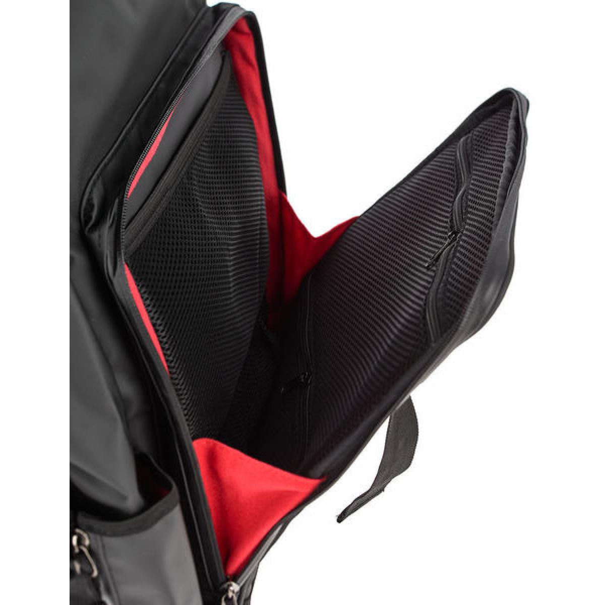 botones Compartimento para computadora portátil independiente (hasta 17 ") con apertura lateral Compartimento frontal grande con bolsillos de red para auriculares, tarjeta de sonido, cable y pequeños accesorios Bolsillo lateral para documentos de viaje, así como bolsillo para botella, paraguas, etc. Panel trasero acolchado y correas de mochila con forma ergonómica con cierre de pecho ajustable Correa desmontable del carro para sujetarlo a un carro Se puede llevar como equipaje de mano - hasta 56 cm de alturaDimensiones exteriores: 49-65 x 38 x 26 cmDimensiones internas: 47-56 x 32 x 20 cmPeso: 2,4 kgColor: Exterior negro, dentro de rojo