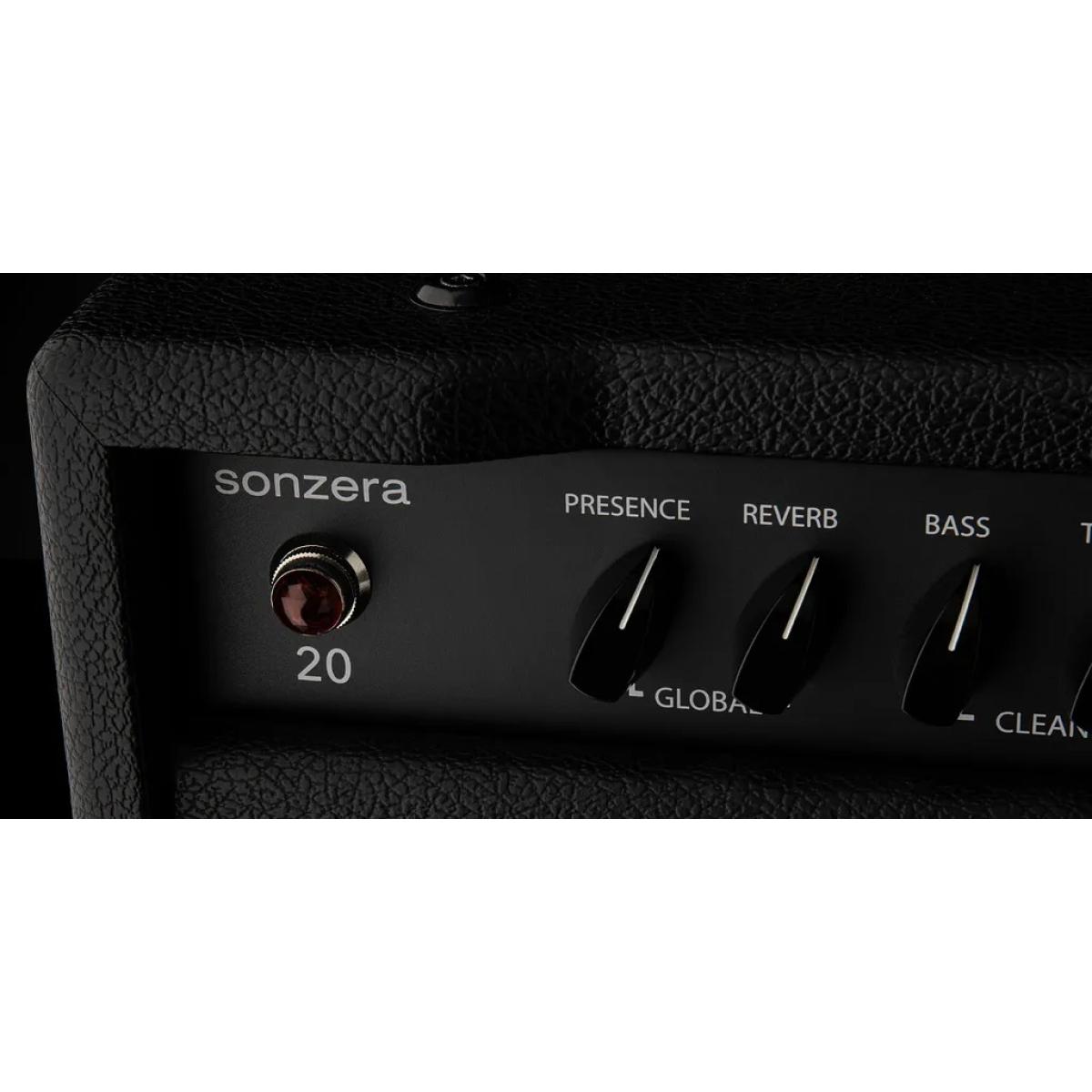 • El Sonzera 20 es un amplificador combo de 20 vatios de potencia moderada con dos canales controlados de forma independiente y conmutables con el pie, diseñado para ofrecer la máxima versatilidad. El canal limpio ofrece tonos completos y tridimensionales que recuerdan a los amplificadores americanos de mediados de los 60. El canal de ganancia está relacionado con el canal limpio en cuanto al circuito, de modo que puede configurarse para que actúe como un canal limpio amplificado o manipularse para que los canales suenen como dos amplificadores completamente diferentes (el canal de ganancia puede ajustarse desde una distorsión ligera a una muy fuerte simplemente utilizando los controles de unidad y nivel). El interruptor de brillo en el canal de ganancia ha sido cuidadosamente adaptado para ofrecer un chasquido de gama alta familiar y es particularmente eficaz en las cuerdas graves, la configuración de pastillas de mástil, y con bobinas simples, mientras que la respuesta de gama baja del canal de ganancia es completa, ajustada y clara.