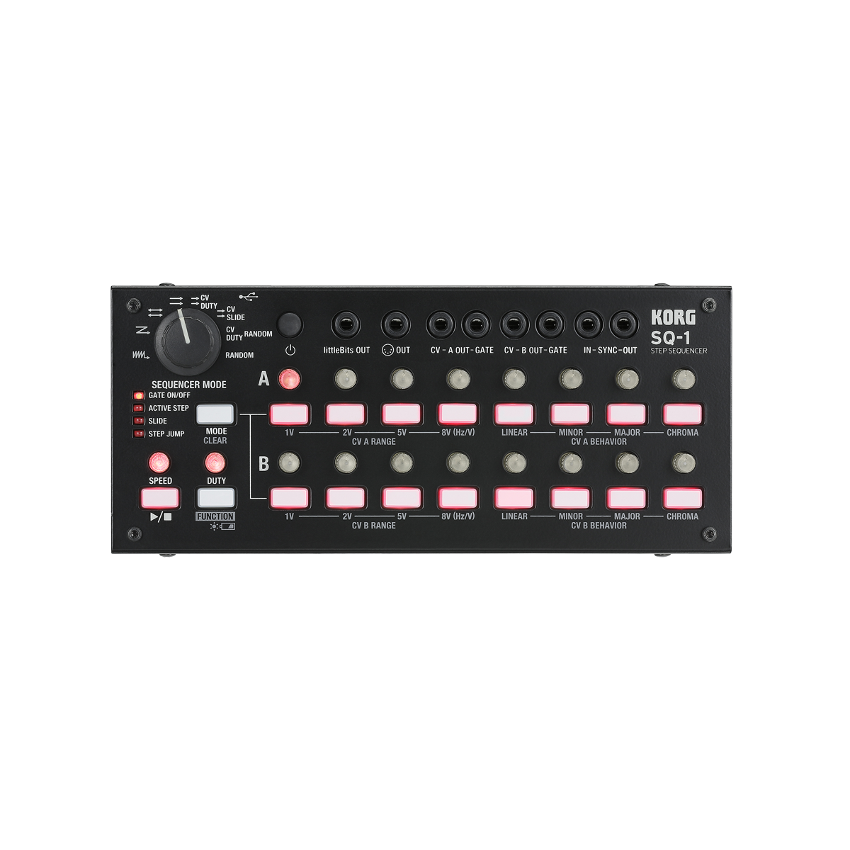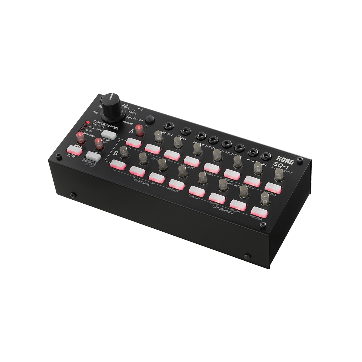El SQ-1 proporciona dos canales (A y B) de secuenciador de 8 pasos que pueden operar consecutivamente, o ser usados en una variedad de otros modos. Por ejemplo, puede ejecutar A y B seguidos para funcionar como un secuenciador de 16 pasos, ignorar el orden y hacer que los pasos se reproduzcan aleatoriamente, o utilizar A y B para controlar diferentes parámetros mientras se ejecutan en paralelo. Desde secuencias simples hasta cambios complejos, puede elegir entre una variedad de modos para satisfacer sus necesidades.