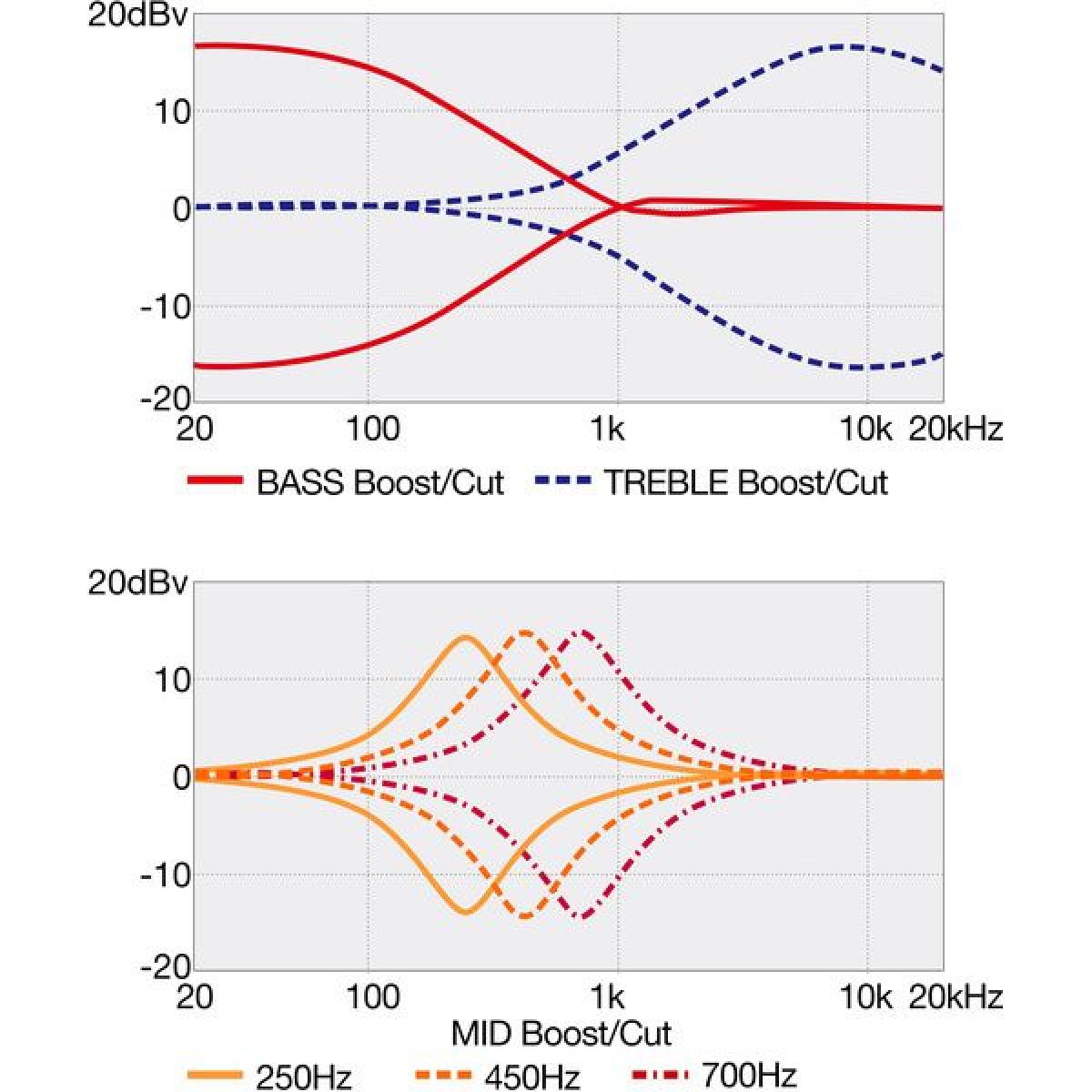 • Controles: volumen, equilibrador, graves, medios y agudos con control de tono pasivo ;