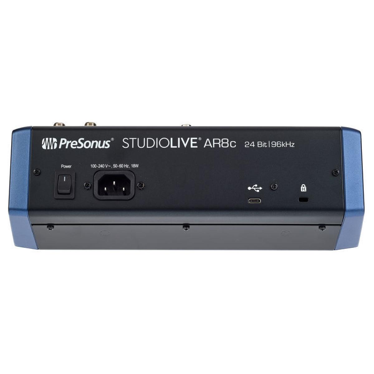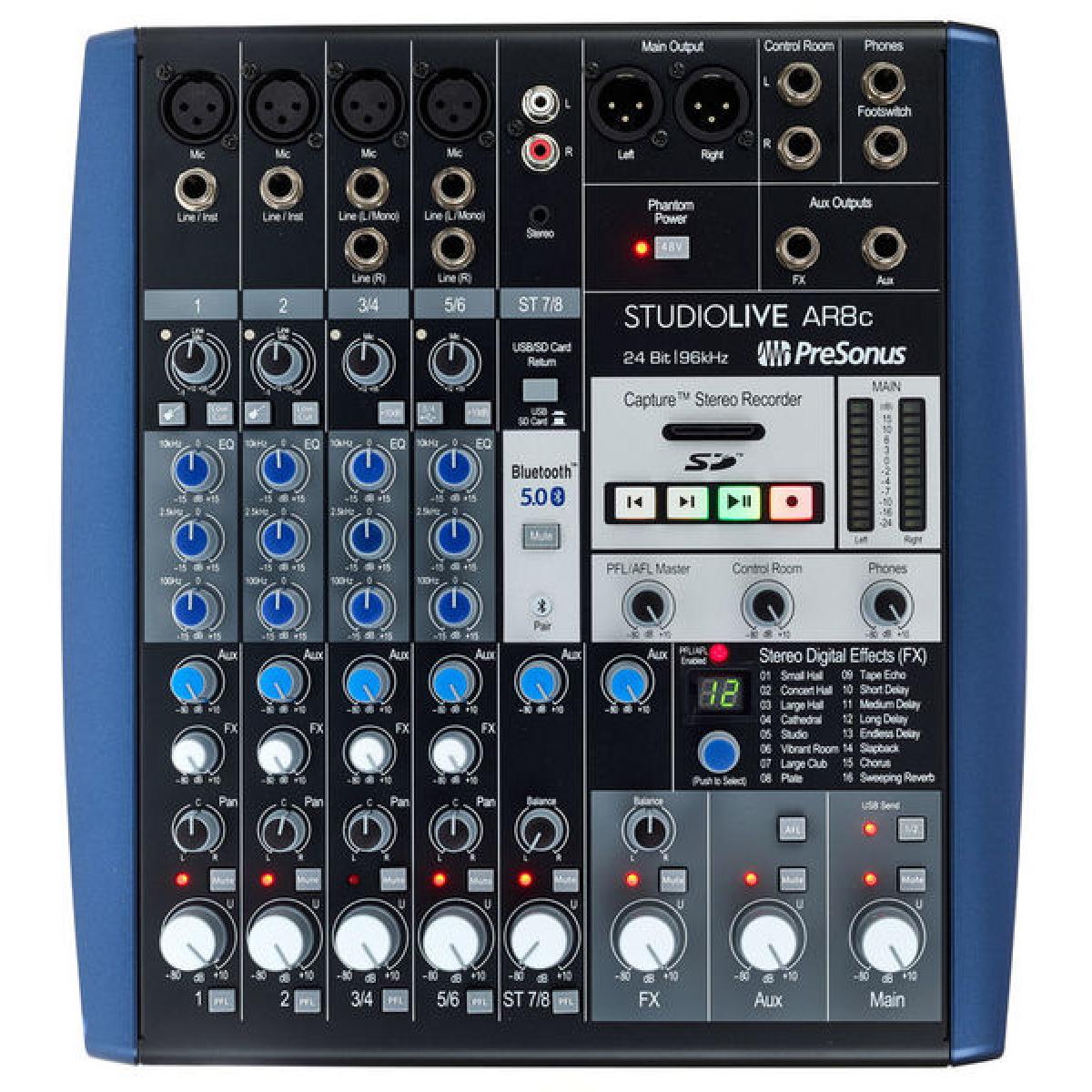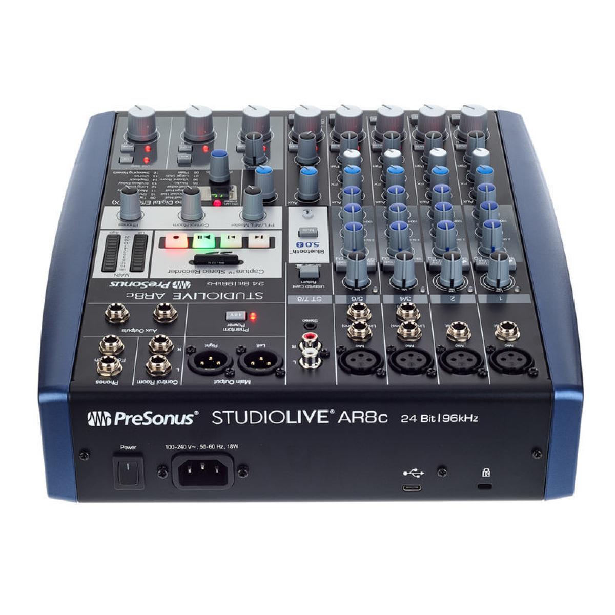 El mezclador también cuenta con entradas de micrófono y de línea, lo que le permite grabar directamente desde el mezclador a partir de una serie de equipos. El StudioLive AR8c también cuenta con alimentación fantasma de 48V, lo que le permite grabar dispositivos compatibles como micrófonos de condensador. Además, el mezclador cuenta con controles rotativos para Solo Master, Sala de Control, Teléfonos, FX, Monitoreo, Principal y más.