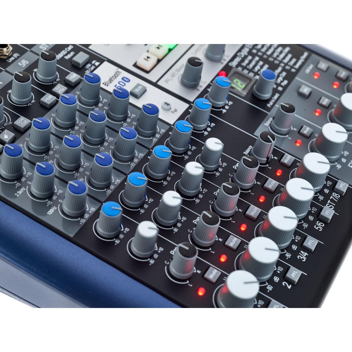- 2 canales mono y 2 estéreo, cada uno con botón de nivel, pan, mute, PFL solo, filtro pasa-altos y EQ semiparamétrico de 3 bandas