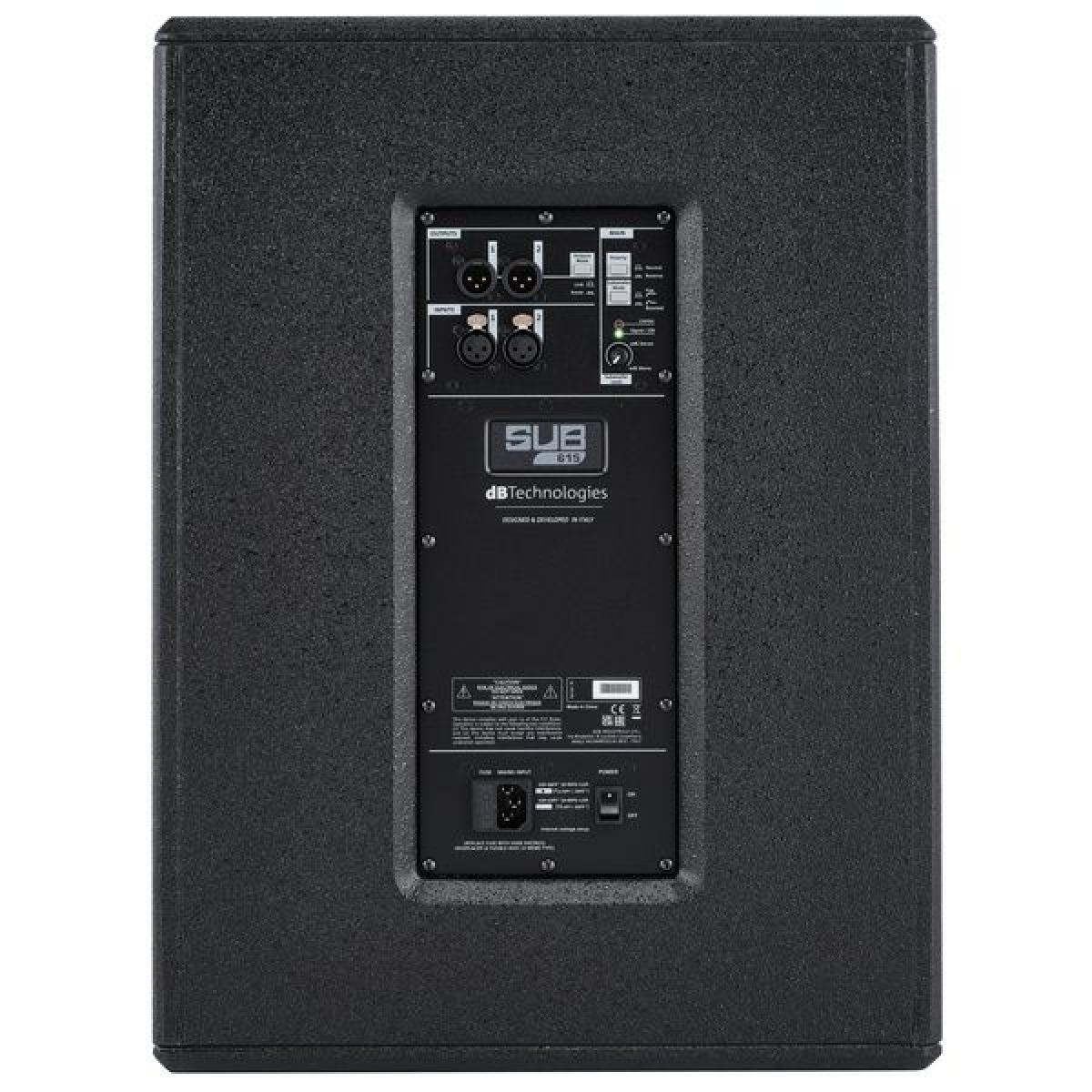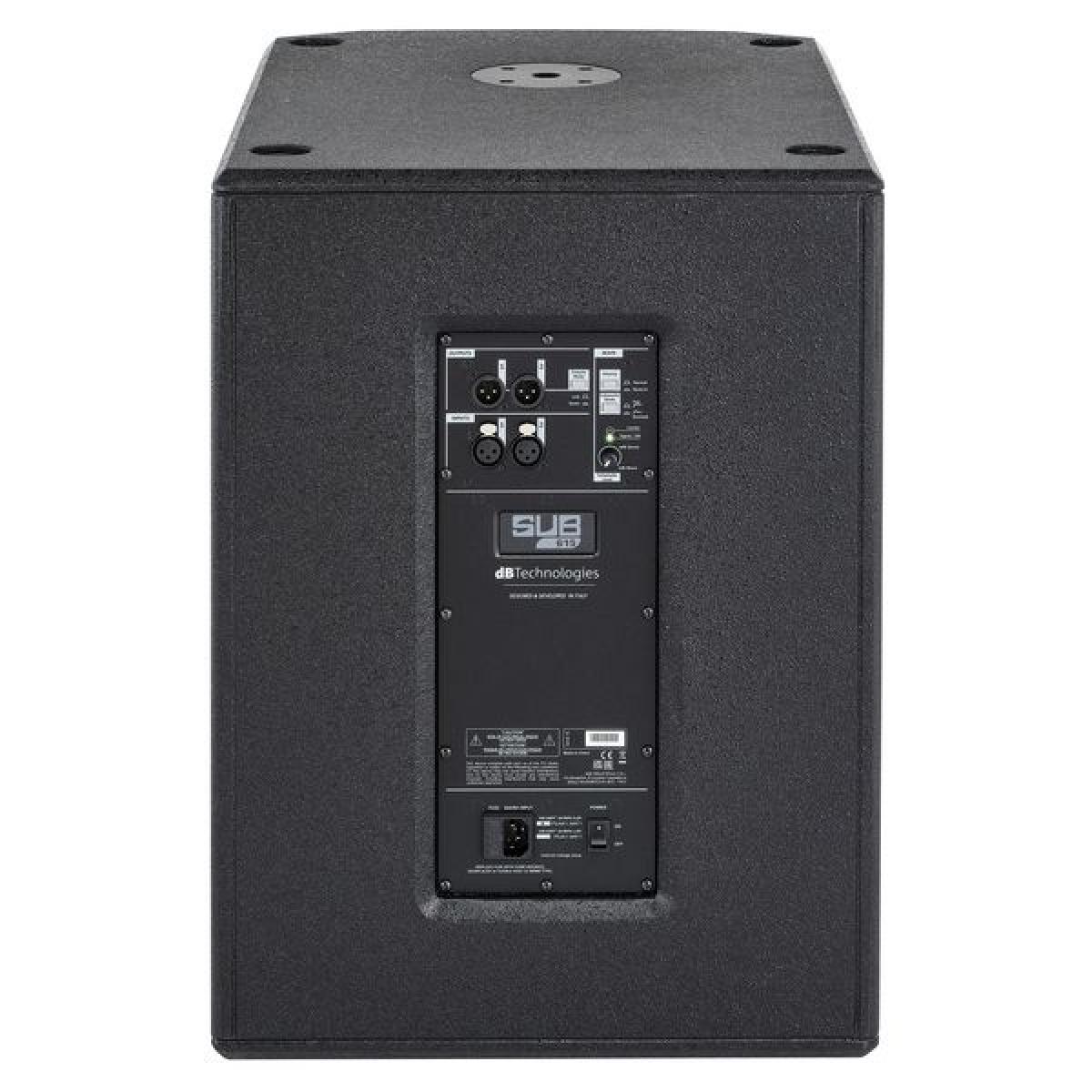 Subwoofer activo profesional dB Technologies SUB 615 de 15", con amplificación integrada y diseño robusto para refuerzo de graves en sistemas de sonido en directo, DJ e instalaciones PA.