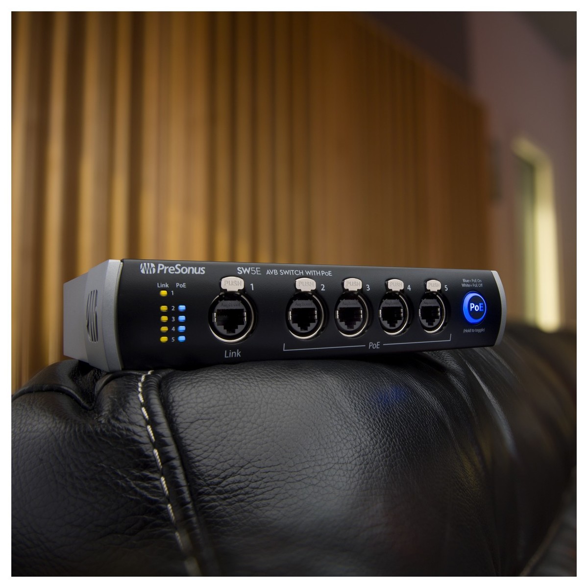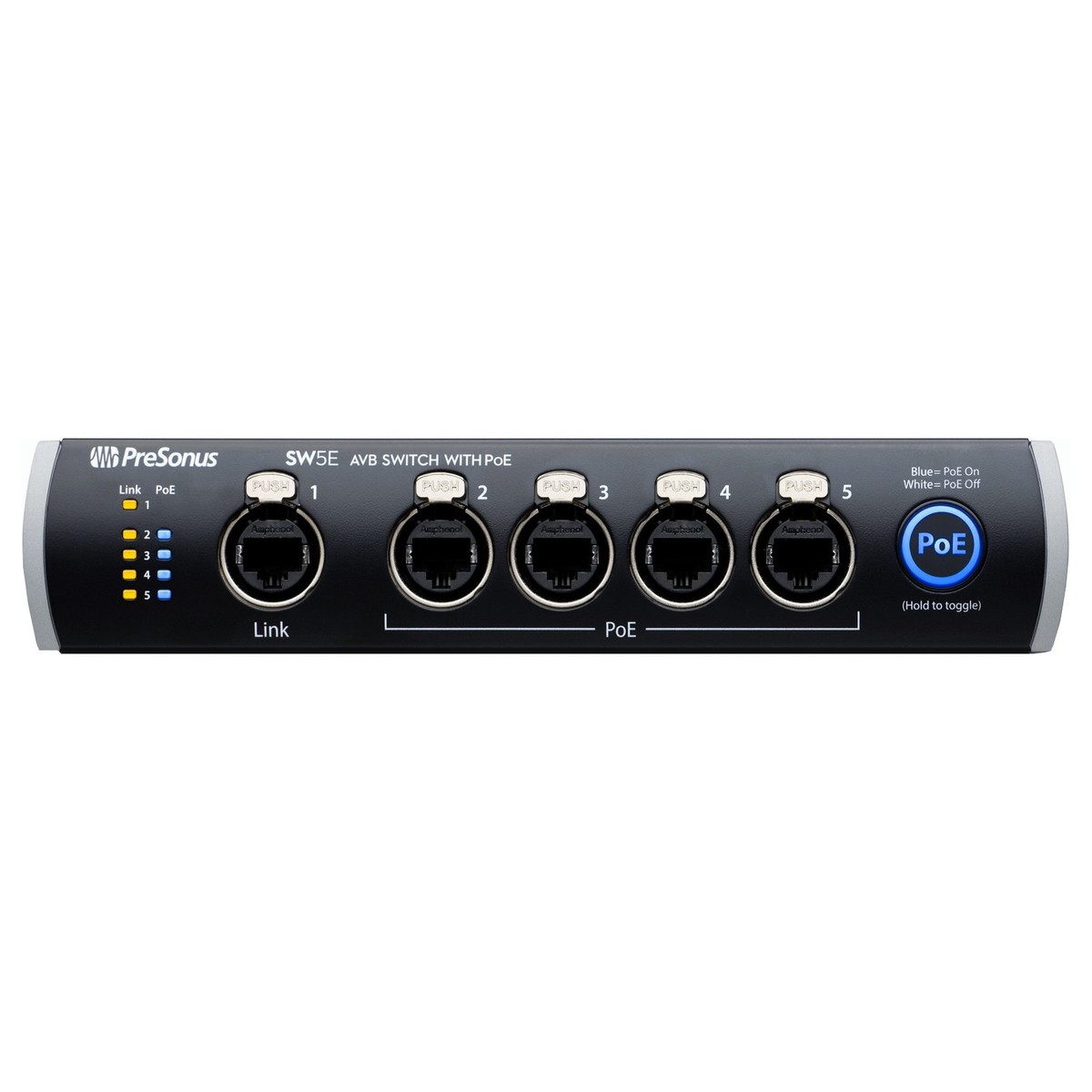 Conmutador PreSonus SW5E AVB Características principales Conmutador de puente de audio / visual versátil 5 Bloqueo de conector XLR Tecnología PoE (Power Over Ethernet) Indicadores de alimentación PoEF Fuente de alimentación interna con conmutador IECPreSonus SW5E AVB Descripción general El conmutador PreSonus SW5E AVB es un conmutador de red AVB compacto y versátil , con un diseño robusto, ideal para aplicaciones audiovisuales en vivo. El SW5E presenta un diseño simplificado con 5 conectores Ethernet AVR con bloqueo XLR y 4 puertos PoE. Es ideal para una variedad de aplicaciones, especialmente para sistemas de sonido en vivo. El diseño de baja latencia garantiza un rendimiento de audio óptimo y se puede utilizar con una variedad de equipos. La tecnología PoE (Power over Ethernet) ofrece la capacidad de alimentar dispositivos compatibles. Hay 4 puertos PoE en total, completos con una puerta de enlace. Los conectores de bloqueo garantizan la máxima estabilidad para sus entradas, proporcionando la máxima protección contra contratiempos. La unidad también cuenta con un diseño de inspección técnica con su chasis totalmente metálico para trabajos pesados.Descripción completaConmutador de puente de audio / visualEl conmutador AVB PreSonus SW5E es la solución de red perfecta para aplicaciones de audio visual y en vivo. El SW5E tiene un diseño simple pero efectivo, con tecnología PoE (Power Over Ethernet) integrada, lo que le permite alimentar dispositivos directamente desde el conmutador. El panel frontal tiene cinco conectores en total, con el primer canal actuando como enlace principal y los otros cuatro canales actuando como entrada con tecnología PoE. Además de ser la solución ideal para una variedad de equipos, AVB Switch alcanza su potencial cuando se usa con mezcladores digitales PreSonus StudioLive. El SW5E actúa como piedra angular en cualquier configuración audiovisual y facilita la conmutación de fuentes Tecnología PoE (Power Over Ethernet) Una de las características más innovadoras del SW5E incluye la tecnología PoE (Power Over Ethernet) integrada. Esta revolucionaria tecnología permite que el cable de red cargue energía eléctrica a dispositivos compatibles. Esto le permite alimentar varios dispositivos a través del interruptor AVB, minimizando la necesidad de tediosas fuentes de alimentación. La tecnología PoE está diseñada para transportar datos de red y energía eléctrica simultáneamente, con baja latencia para optimizar el rendimiento del audio. Diseño resistente y fácil de mantener El diseño versátil presenta una construcción de carretera, ideal para usar en la carretera. Una de las características más importantes pero que se pasa por alto son los conectores Ethernet entrelazados. Esto bloquea el cable en su lugar una vez colocado en una entrada, lo que minimiza los contratiempos, como que las personas se tropiecen con los cables y los suelten. Esto es fundamental en los musicales en vivo, ya que garantiza que la red no falle debido a errores humanos. La unidad en sí está construida con un robusto chasis totalmente metálico, que también se puede montar con un bastidor mediante una bandeja de bastidor. Cuenta con una fuente de alimentación interna, así como un conector IEC estándar para una confiabilidad óptima. Montaje en bastidor de metal resistente (tornillos en la bandeja del bastidor) Especificaciones Puertos AVB: Puertos PoE Ethernet XLR de 5 candados: Compatible con 4PoE: IEEE 802.3at-2009 (Tipo 1) Ancho de banda operativo: 10/100/1 Gigabit Panel frontal: 5 LED actividad, 4 LED de alimentación PoEP activos: 100-230 V, 50-60 Hz, 65 W Dimensiones: 1,7 "x 8,5" x 7 "(44 x 217 x 178 mm)