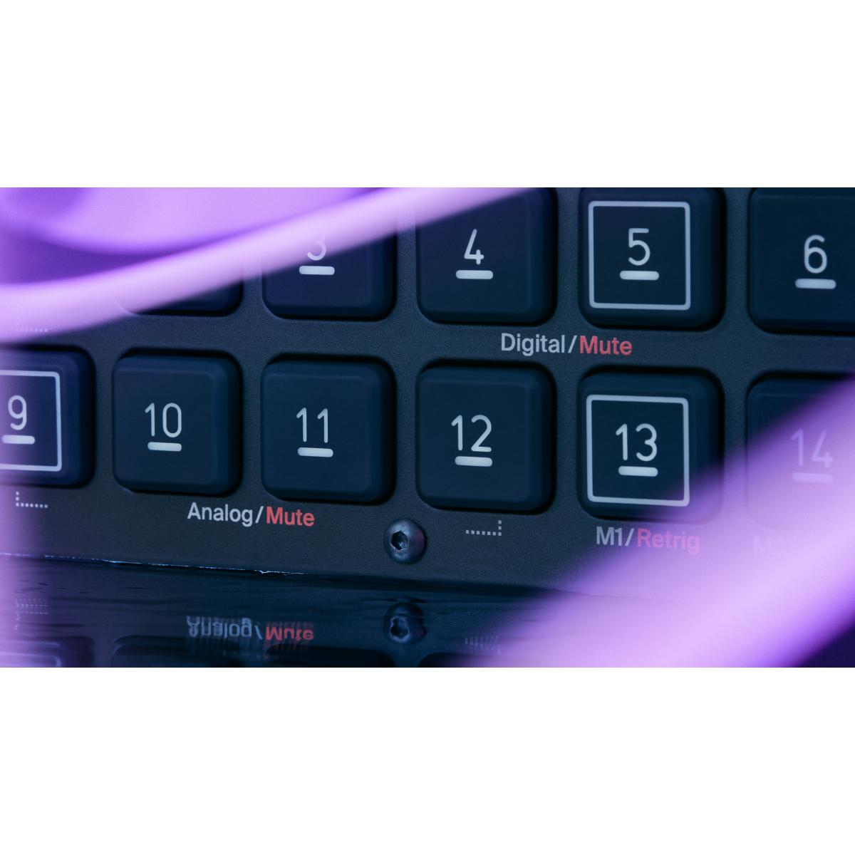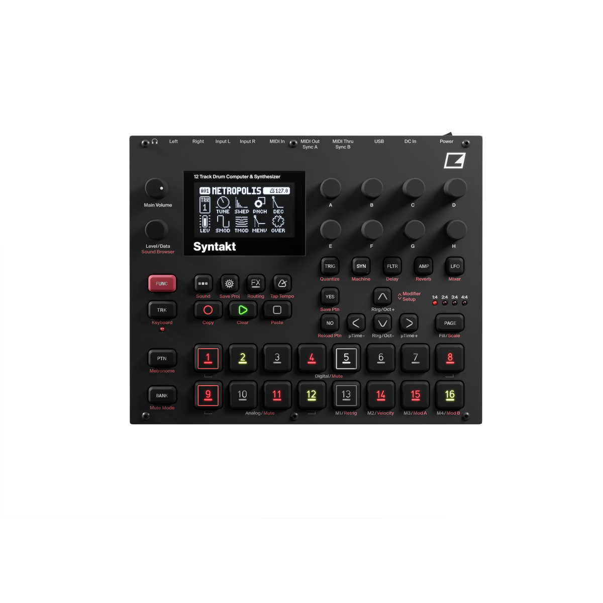 Navega por los parámetros y los ajustes mediante la nítida pantalla OLED, que cuenta con elegantes gráficos que proporcionan información visual sobre los distintos modificadores y ajustes. La composición es fácil gracias a la variedad de escalas que ofrece el modo de teclado. También puede añadir textura a sus sonidos mediante los efectos incorporados delay y reverb. Elige entre pistas de batería analógicas y digitales o combínalas, para crear algo único para ti. El diseño del Syntakt es intuitivo y ergonómico, con botones claramente etiquetados y retroiluminados, con codificadores de precisión y una serie de opciones de conexión disponibles.