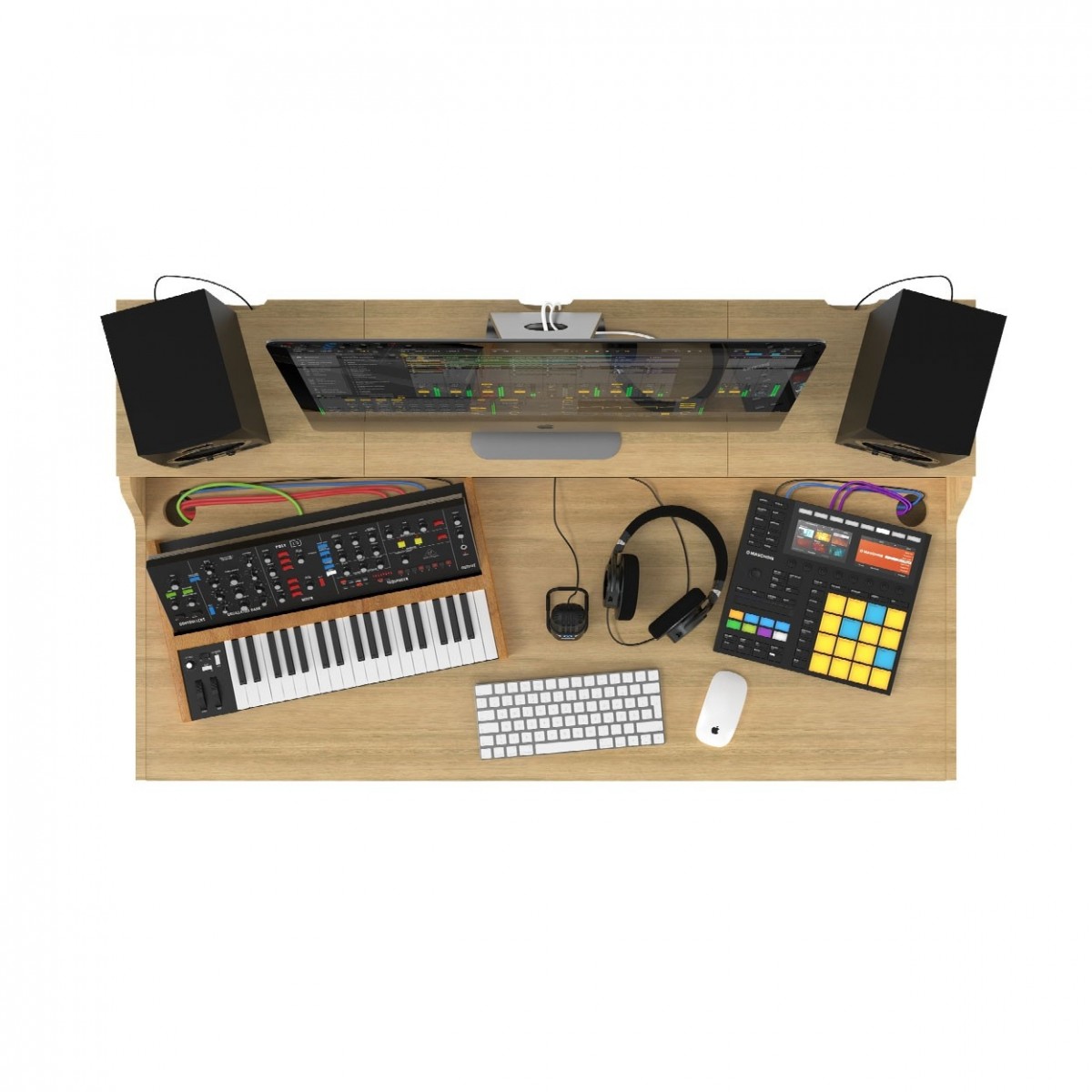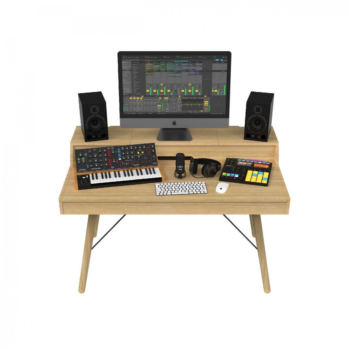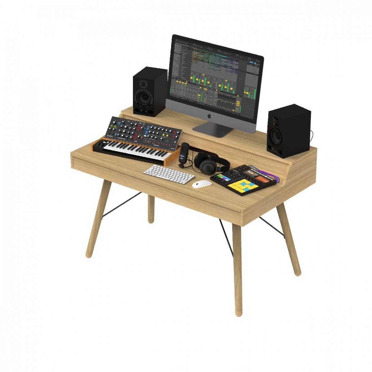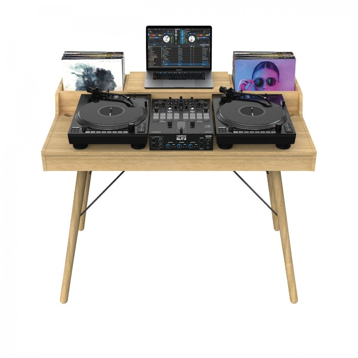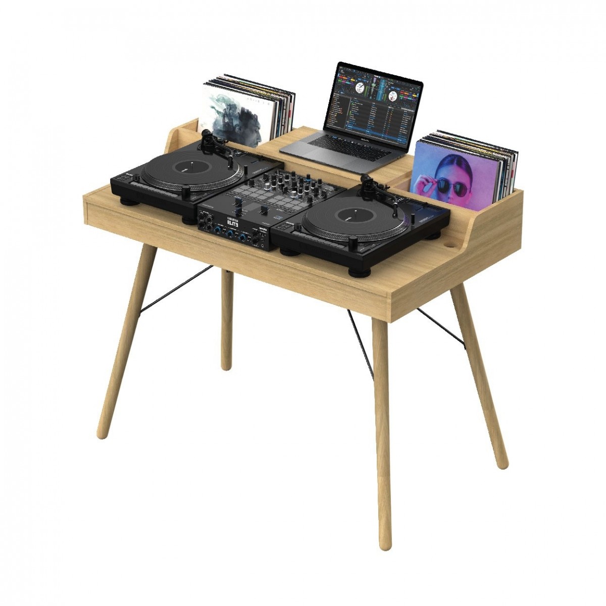 - Estación musical híbrida tanto de escritorio de DJ con almacenamiento de vinilos como de estación de trabajo de estudio