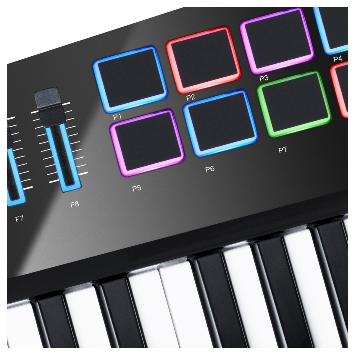 Pads de división asignables Pads: 8 pads sensibles a la velocidad, retroiluminación multicolor, deslizadores MIDI asignables: 8 deslizadores, retroiluminación azul, asignables por MIDI, 1 deslizador de volumen, modulación asignable por MIDI: