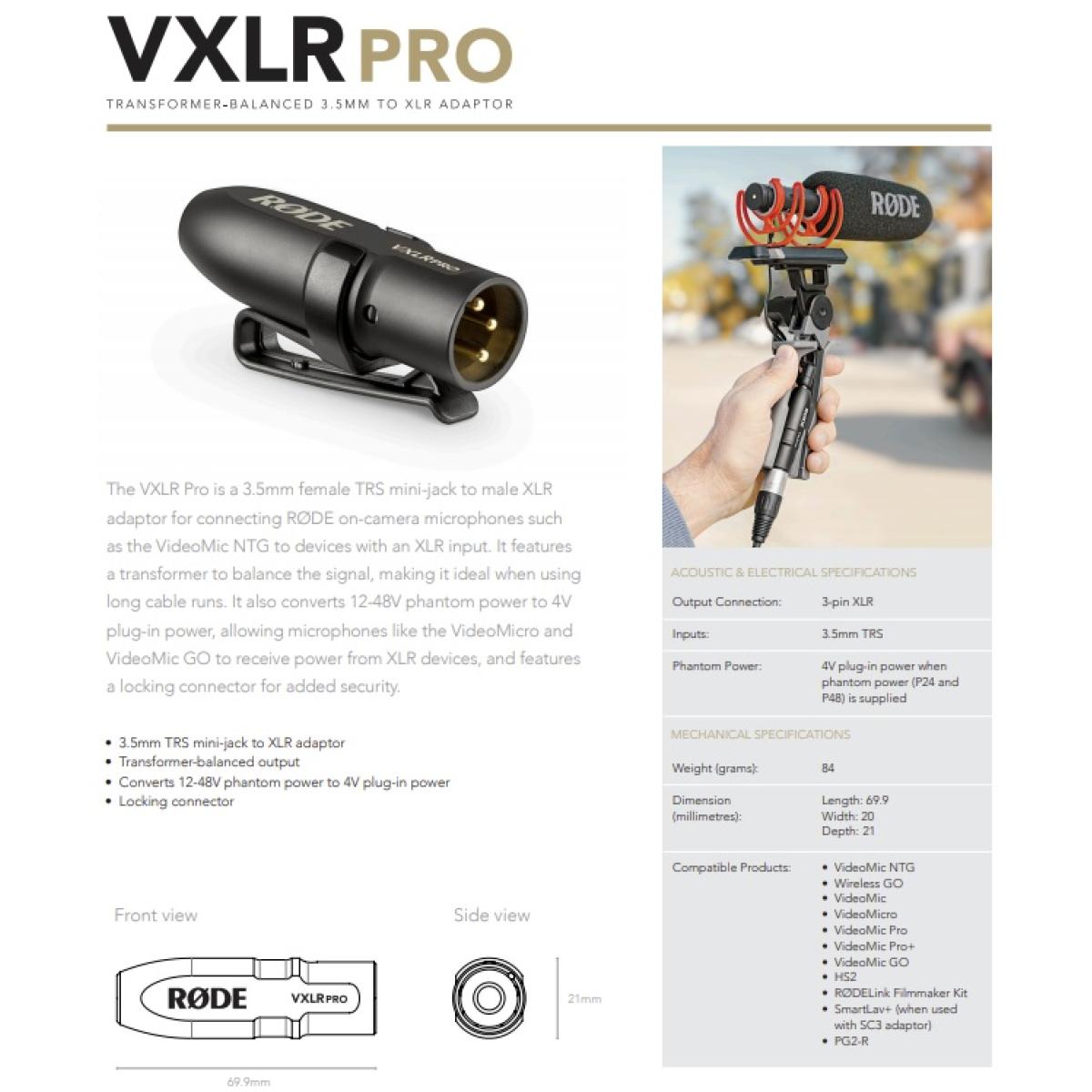 El VXLR Pro te permite utilizar tus micrófonos favoritos de cámara de Rode con una entrada XLR. El Rode VXLR también proporciona energía a algunos micrófonos (por ejemplo, VideoMic GO) mediante la conversión de 12-48V Phantom Power a 4V.