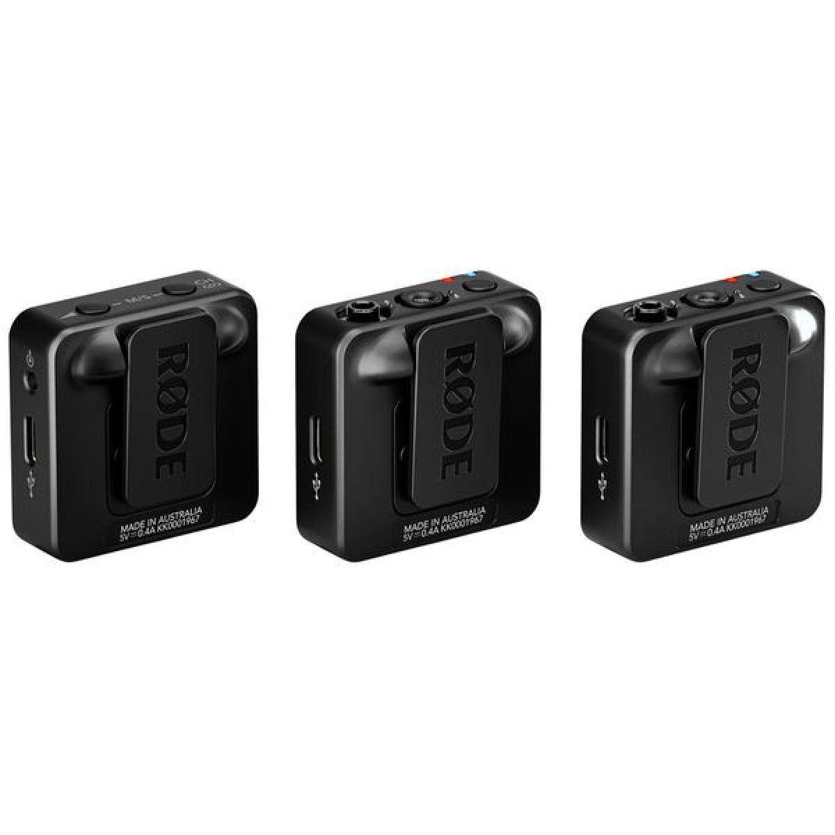 • Dos módulos transmisores (TX) con micrófono de condensador integrado (cápsula omnidireccional) y un módulo receptor (RX) con conexión de auriculares para una tercera señal de micrófono ;