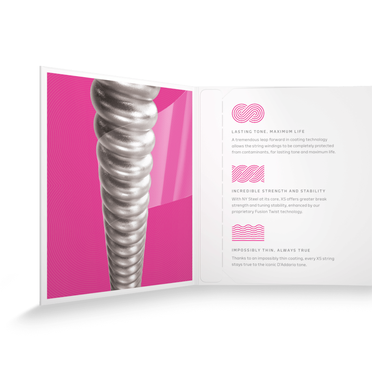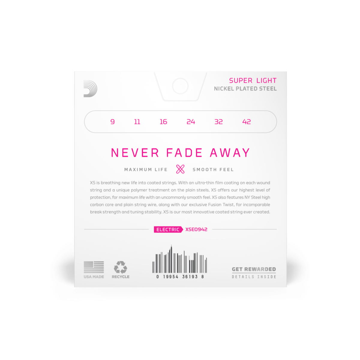 Las cuerdas XS Nickel tienen la vida más larga de cualquier cuerda eléctrica D'Addario, además de una sensación suave y rápida, gracias al revestimiento de película XS ultra-delgada.