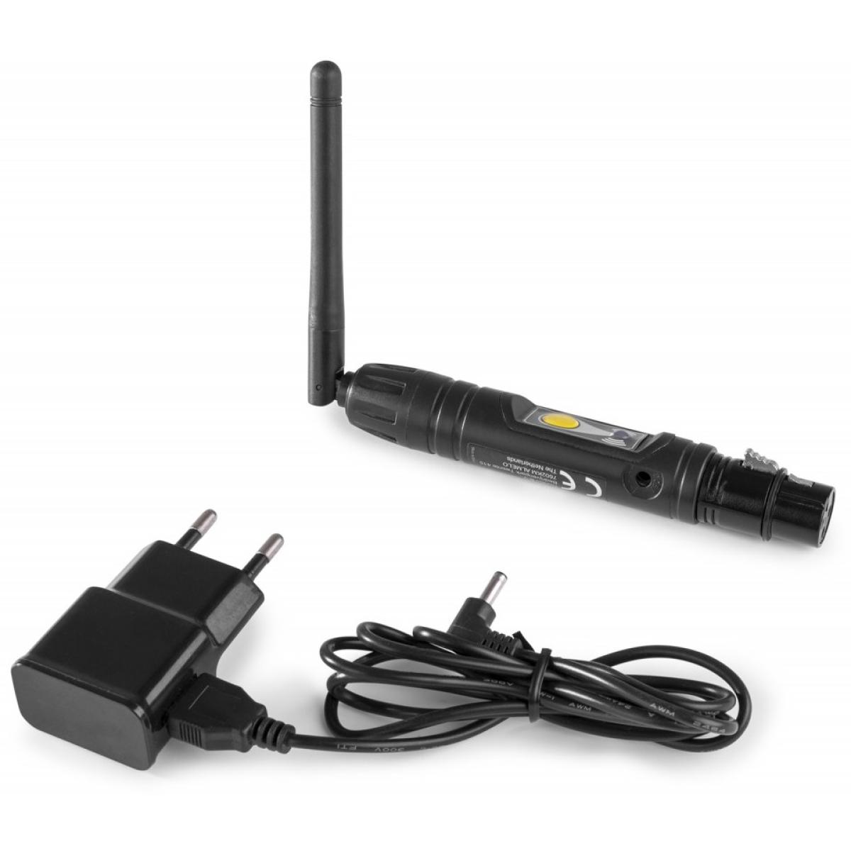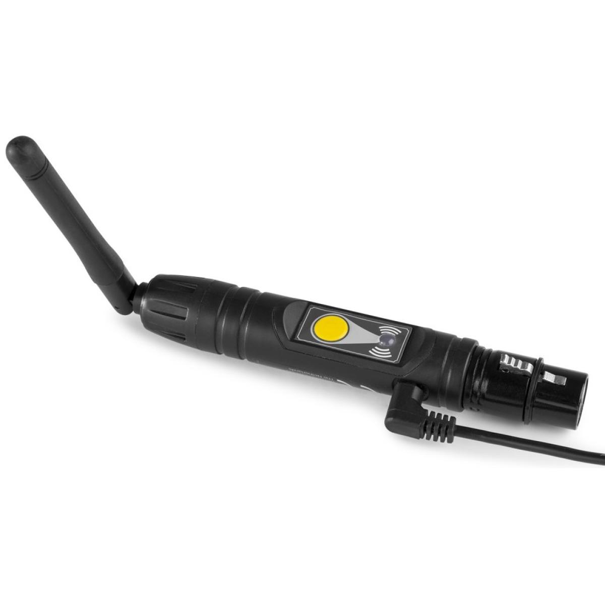 Transmissor/receptor sem fios compacto de DMX que pode controlar até 7 universos. Cada universo esta indicado com um LED de cor no chassis. Podem usar-se multiplos receptores com um só emissor.