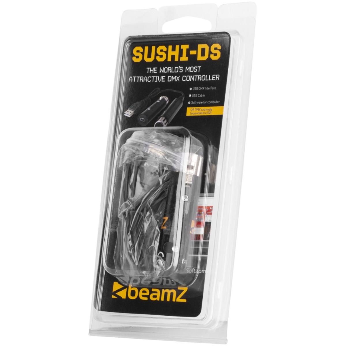O SUSHI BeamZ Edition vem pronto a utilizar com 12 canais (autónomo) e 128 canais DMX (em direto/PC). O SUSHI-DS fornece acesso a quatro tipos diferentes de software DMX, a saber: Sunlite Suite 2004 + Daslight Virtual Controller 1 + Lumidesk lite + Easy Stand Alone 1. O número de canais pode ser actualizado para até 512 directamente a partir da loja virtual www. dmxsoft.com. Rápido e fácil, sem necessidade de devolver a interface. O SUSHI-DS foi desenvolvido para o principiante em iluminação.