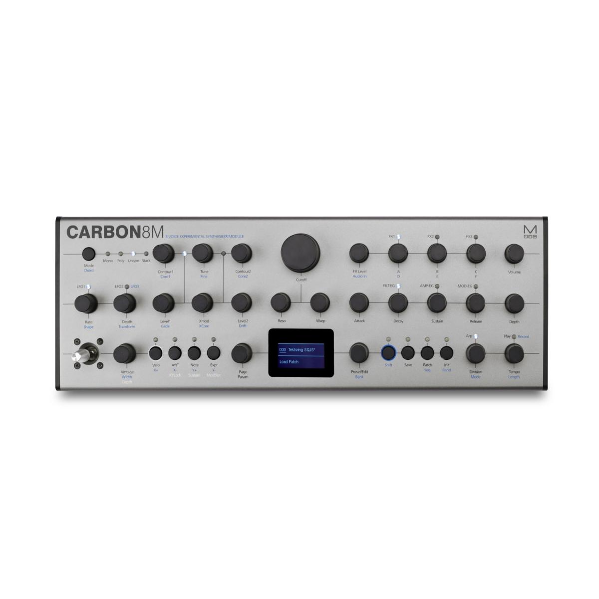 SINTETIZADOR CARBON8MMODULO SINTETIZADOR CARBON8 es un sintetizador experimental de 8 voces que introduce formas radicalmente nuevas para crear, explorar e interpretar sonidos de última generación. Su motor de sonido, que duplica la complejidad de las series ARGON8 y COBALT8, se basa en dos osciladores capaces de generar complejas formas de onda Core algoritmos y tablas de ondas, junto con potentes algoritmos de modulación cruzada XCore, tecnología de filtro avanzada y nuevas capacidades emocionantes de LFO. Además, el CARBON8M cuenta con un aclamado arpegiador, secuenciador y efectos internos que los usuarios de Modal valoran altamente.Este tremendo sintetizador está dirigido a diseñadores de sonido, productores e intérpretes que buscan escapar de los sonidos convencionales y explorar texturas innovadoras para sus producciones musicales.Características principales: 16 osciladores con 56 formas de onda principales generadas en tiempo real 2 por voz, seis modificadores de oscilador estáticos, y funciones 'Vintage' y 'Oscillator Free Run'. 34 tipos de filtro para esculpir el contenido sonoro de la mezcla de formas de onda. Tres generadores ADSR amplificador, filtro y modulación y tres LFO con 15 formas variables, todos modificables. Secuenciador polifónico en tiempo real y por pasos con 512 notas y 4 parámetros grabables/editables, además de un arpegiador programable de 32 pasos con múltiples modos. Tres motores de efectos estéreo personalizables con 26 algoritmos. 500 memorias de patch, totalmente editables, y 300 programas de fábrica. Carcasa metálica premium para escritorio o rack de 19' incluye orejas de rack. Compatible con MODALapp y MPE MIDI. Conexiones: MIDI USB, salidas TS de ' 6,3 mm, salida de auriculares, entrada de audio, E/S MIDI y E/S de sincronización.